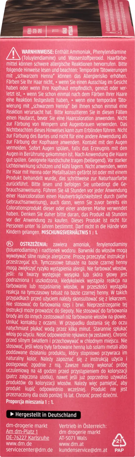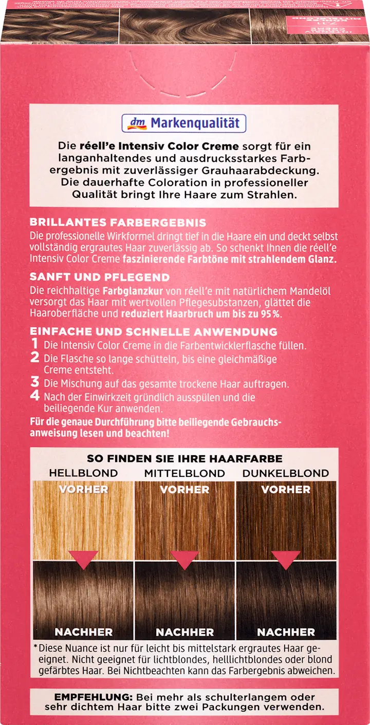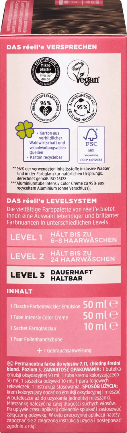 Крем интенсивного цвета réell'e 7.11 Холодный средне-светлый обеспечивает блестящий цветовой результат. Формула профессионального действия глубоко проникает в волосы и надежно покрывает даже полностью поседевшие волосы. При этом она обеспечивает стойкий и выразительный цветовой результат, придавая волосам сияние. Насыщенный цветовой блеск с натуральным миндальным маслом насыщает волосы ценными питательными веществами, разглаживает поверхность волос и уменьшает ломкость до 95%. Для создания завораживающих оттенков с ярким блеском.
