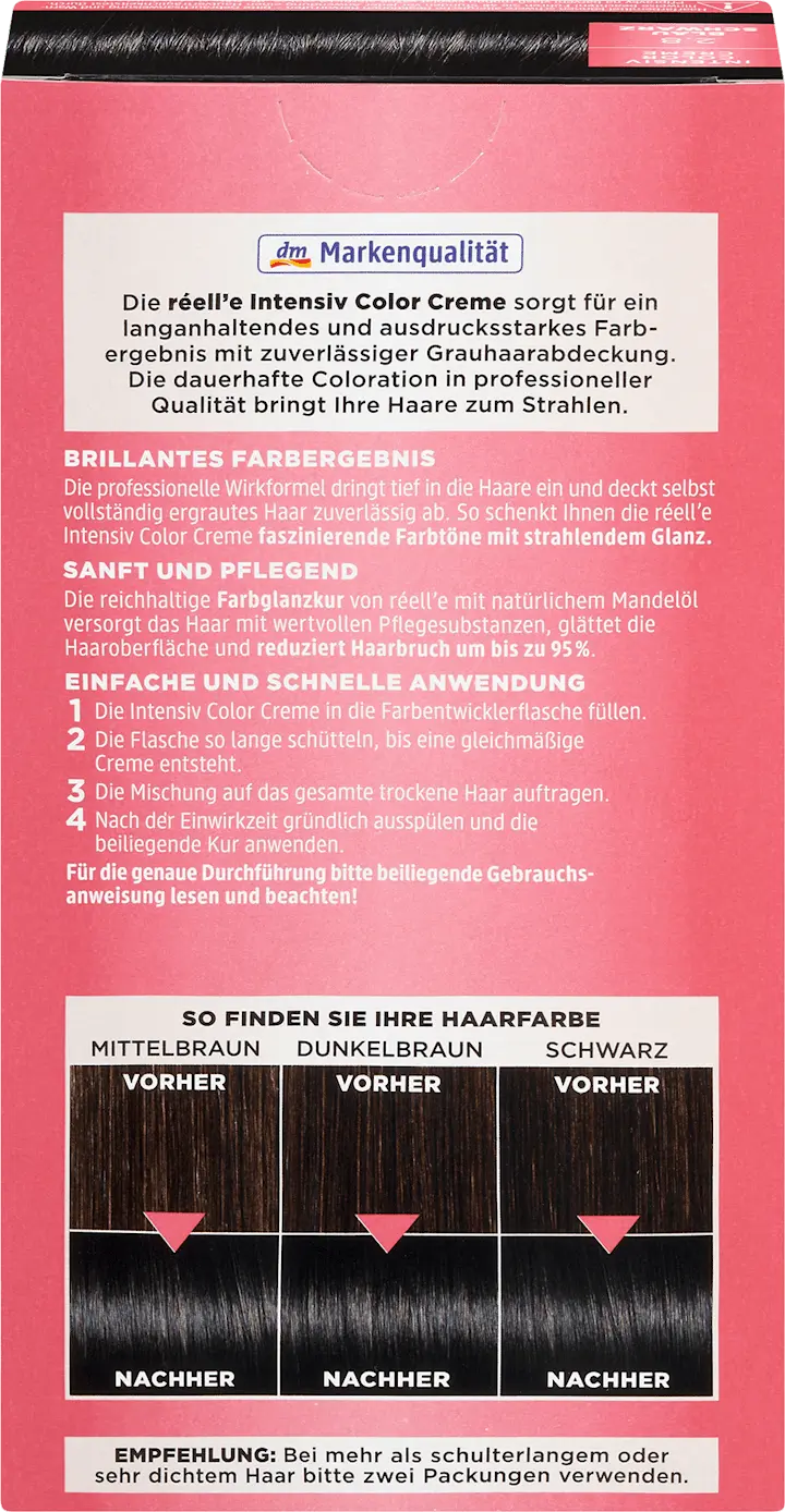 Крем интенсивного цвета réell'e Blue Black 2.8 обеспечивает блестящий цветовой результат. Формула профессионального действия глубоко проникает в волосы и надежно покрывает даже полностью поседевшие волосы. При этом она обеспечивает стойкий и выразительный цветовой результат, придавая волосам сияние. Насыщенный цветовой блеск с натуральным миндальным маслом насыщает волосы ценными питательными веществами, разглаживает поверхность волос и уменьшает ломкость до 95%. Для создания завораживающих оттенков с ярким блеском.