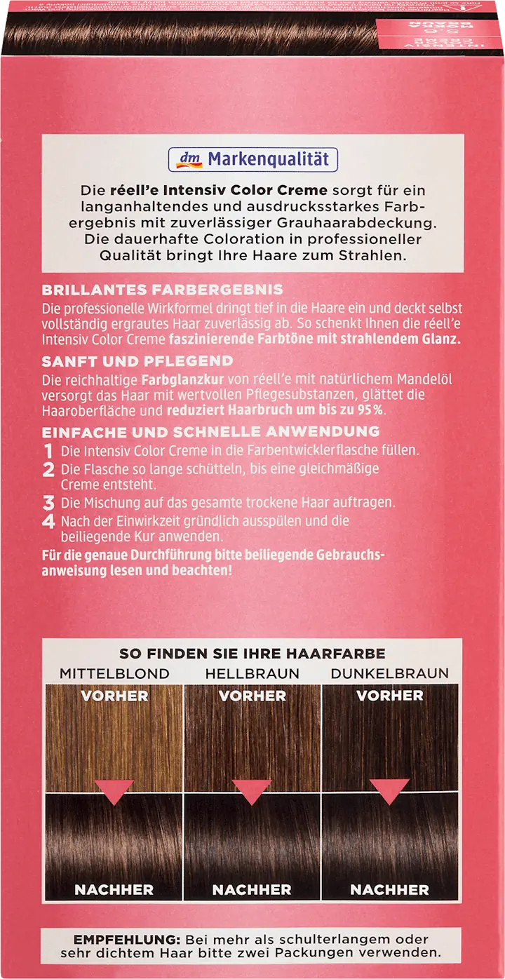 Крем интенсивного цвета réell'e Мокко Коричневый 5.6 обеспечивает блестящий цветовой результат. Формула профессионального действия глубоко проникает в волосы и надежно покрывает даже полностью поседевшие волосы. При этом она обеспечивает стойкий и выразительный цветовой результат, придавая волосам сияние. Насыщенный цветовой блеск с натуральным миндальным маслом насыщает волосы ценными питательными веществами, разглаживает поверхность волос и уменьшает ломкость до 95%. Для создания завораживающих оттенков с ярким блеском.