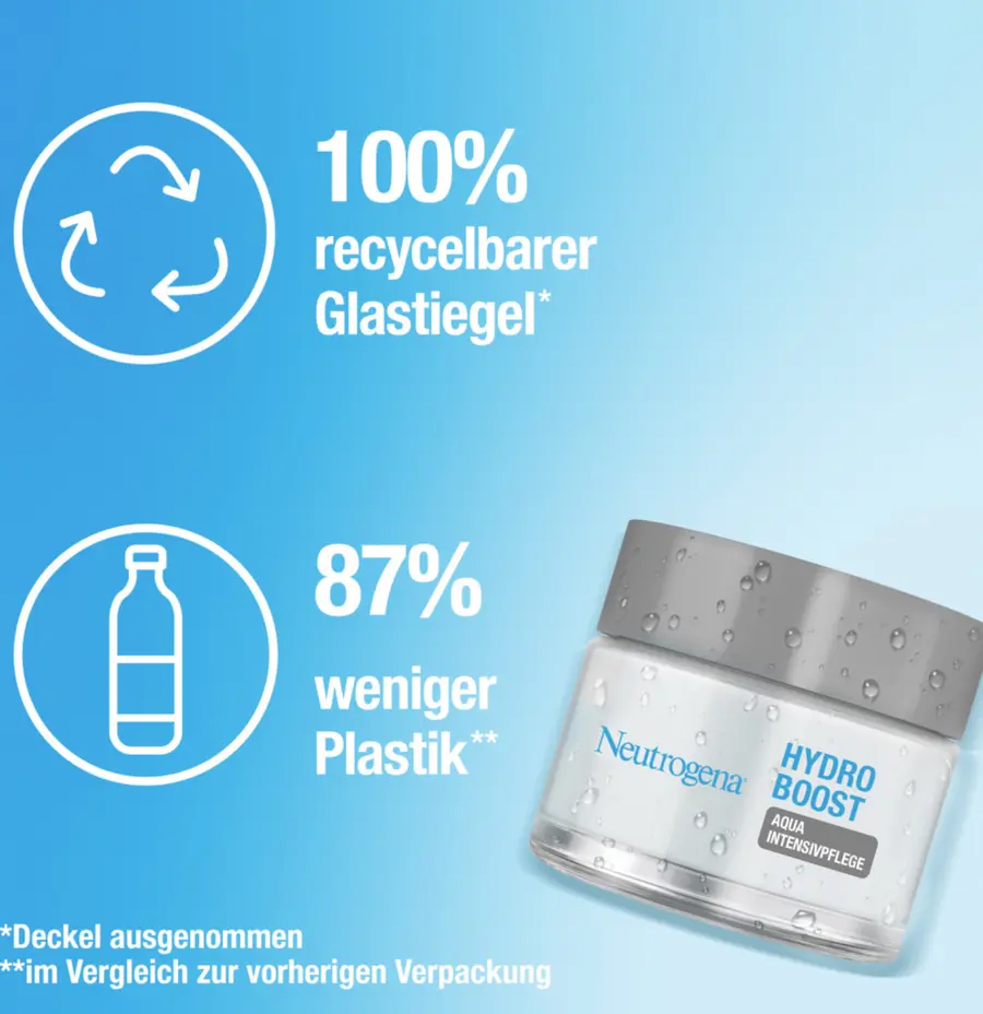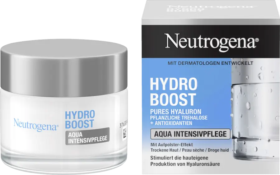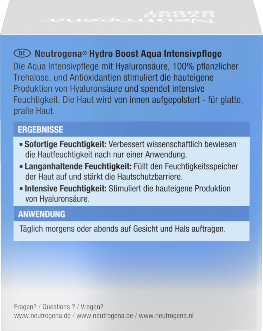 Улучшенная формула: Интенсивный уход Neutrogena Hydro Boost Aqua с гиалуроновой кислотой повышает уровень увлажнения кожи, а трегалоза растительного происхождения помогает удерживать влагу. В то же время антиоксиданты защищают влагозащитный барьер от внешних воздействий*. Интенсивный крем для ухода за лицом нового дизайна смягчает кожу изнутри, стимулирует выработку собственной гиалуроновой кислоты и придает коже заметно гладкий и упругий вид. Кроме того, в креме для лица для сухой кожи на 87% меньше пластика по сравнению с предыдущей упаковкой, а стеклянный тигель на 100% пригоден для вторичной переработки **.