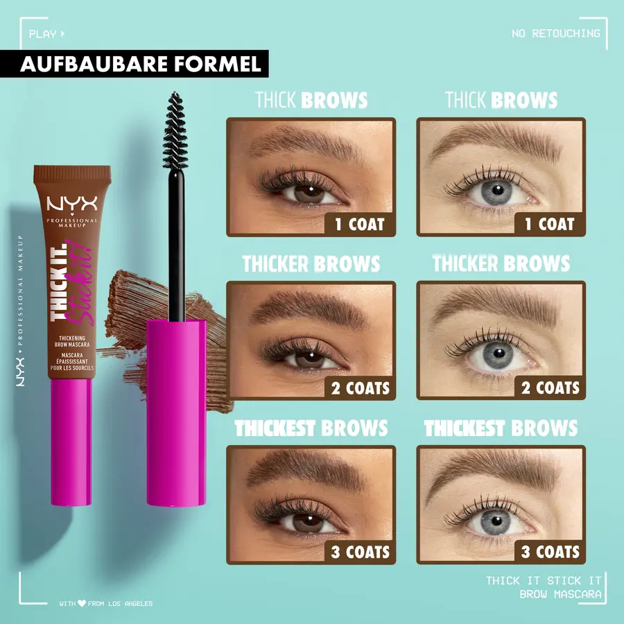 С 3-в-1 NYX Professional Makeup Thick it. Stick it! Тушь для бровей придаст бровям идеальный вид за считанные секунды. Благодаря тончайшей технике уплотнения тушь для бровей придает легендарный и естественный вид, придавая бровям заметно более пышный вид, придавая им дополнительную выразительность и поразительно красивые брови. Кроме того, веганская формула обеспечивает особенно интенсивный цветовой результат и в то же время обеспечивает высокую точность цветопередачи. Специальная технология Brow Glue обеспечивает впечатляюще длительное удержание до 16 часов.