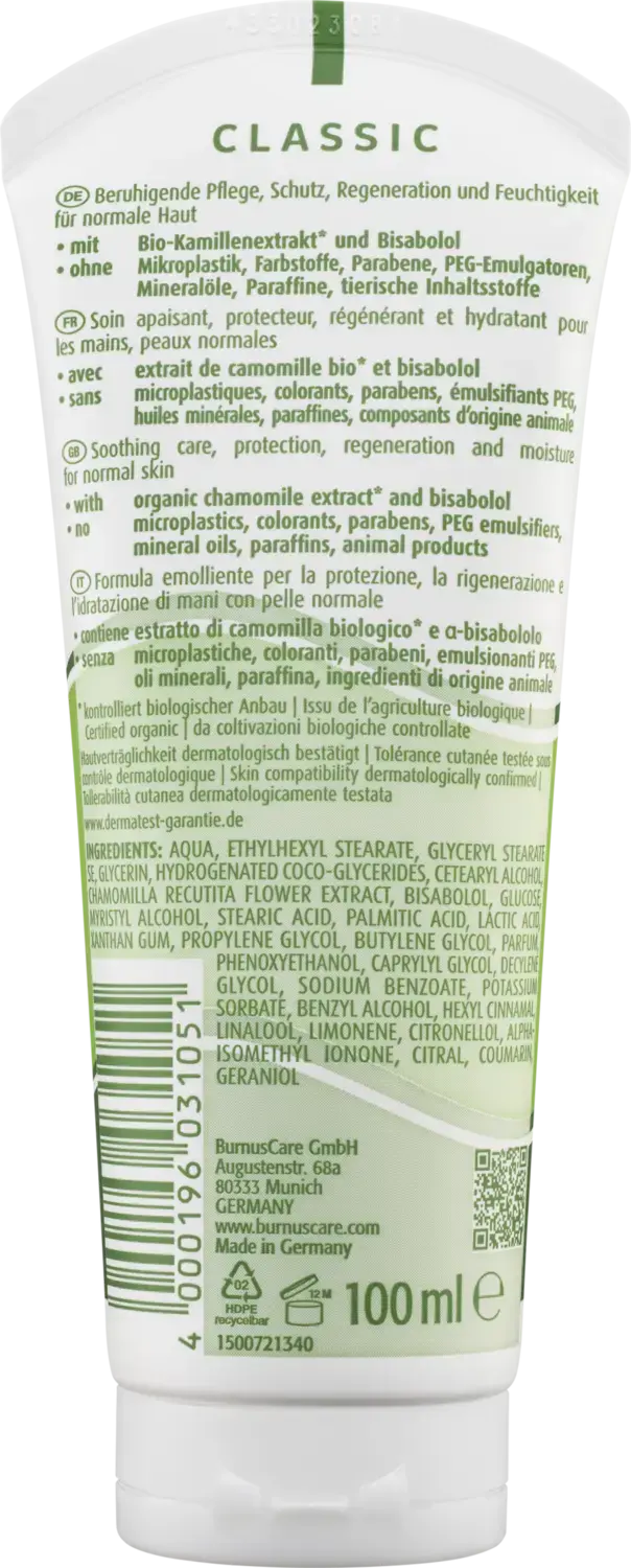 Классический уход за руками для нормальной кожи обеспечивает успокаивающее питание, защиту, регенерацию и увлажнение. Он содержит органическую ромашку, а также бисаболол.