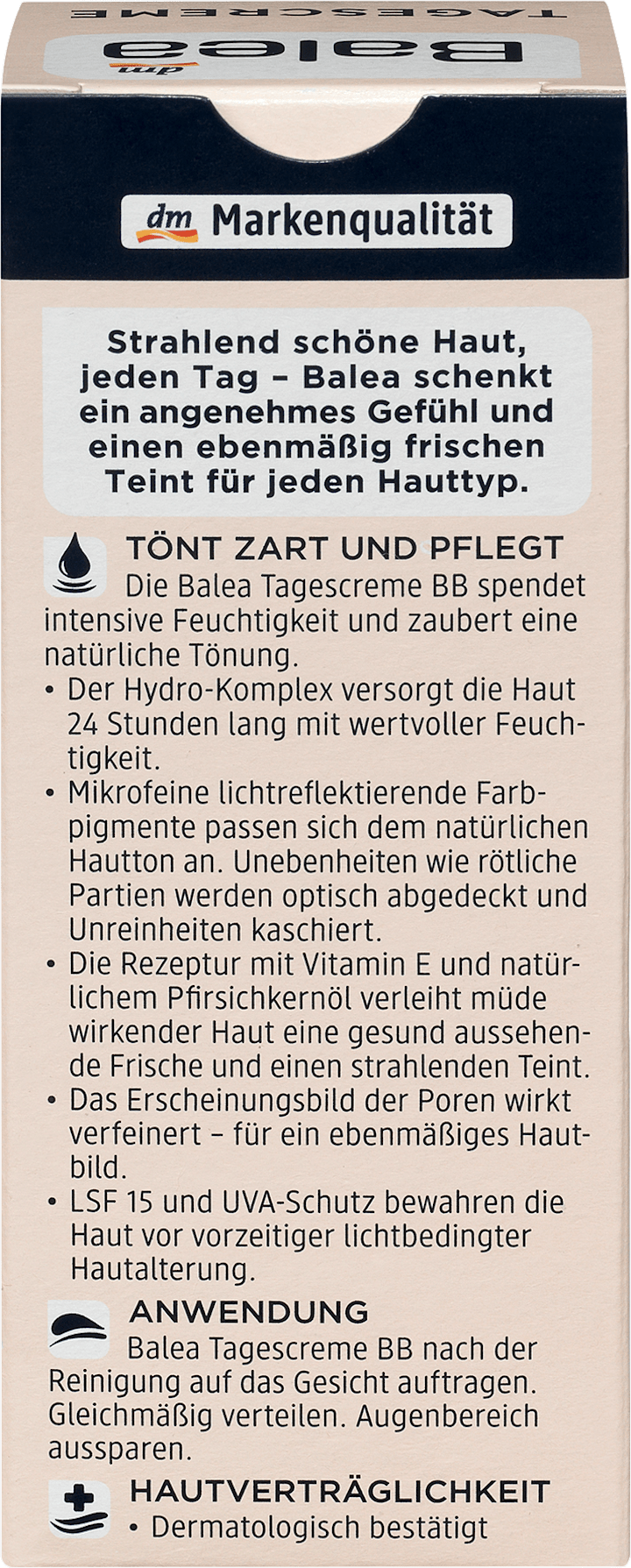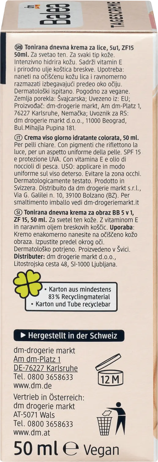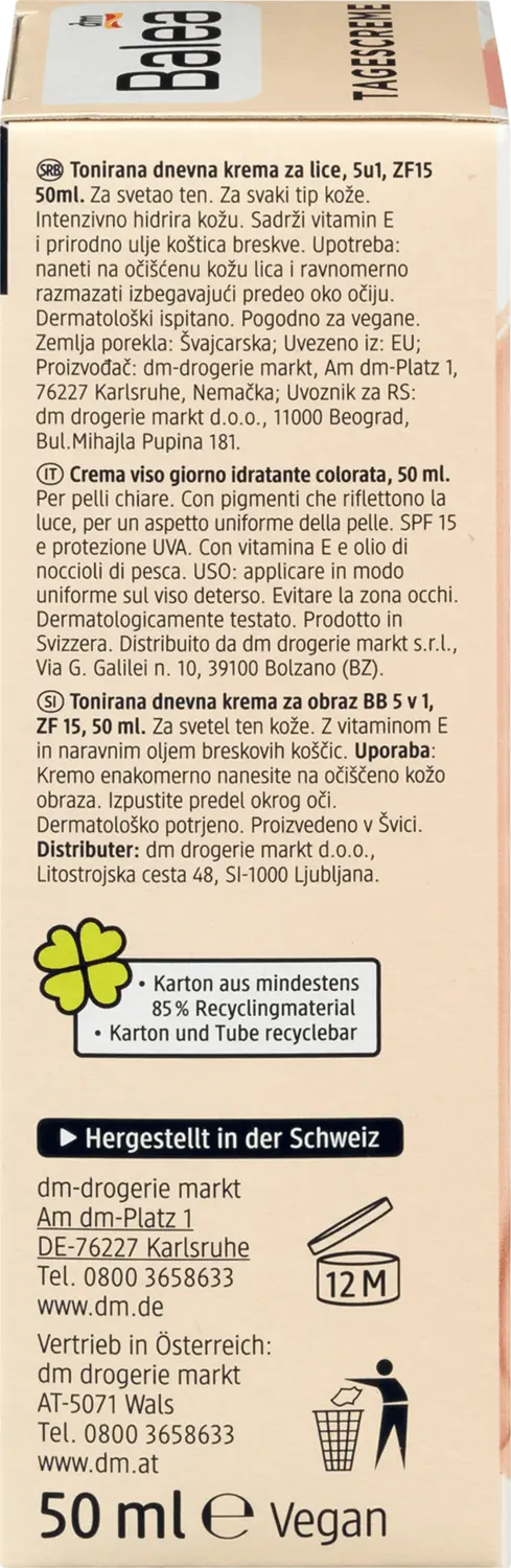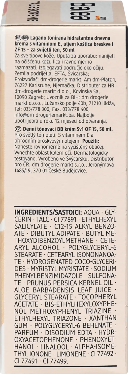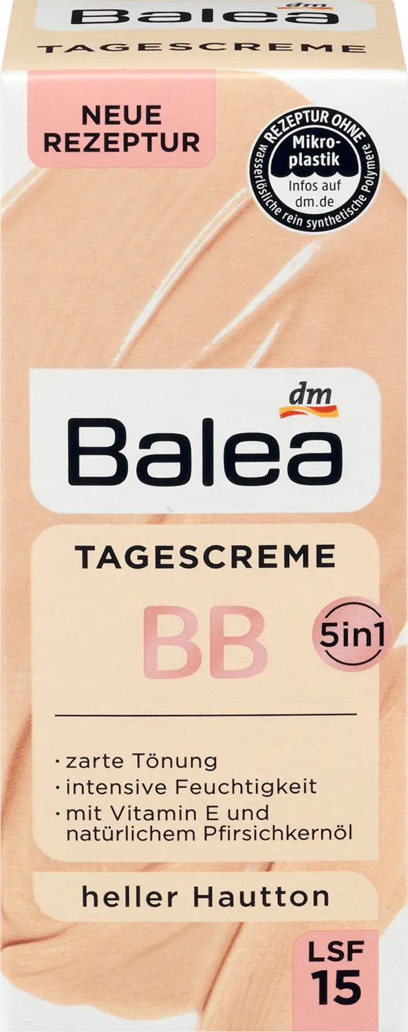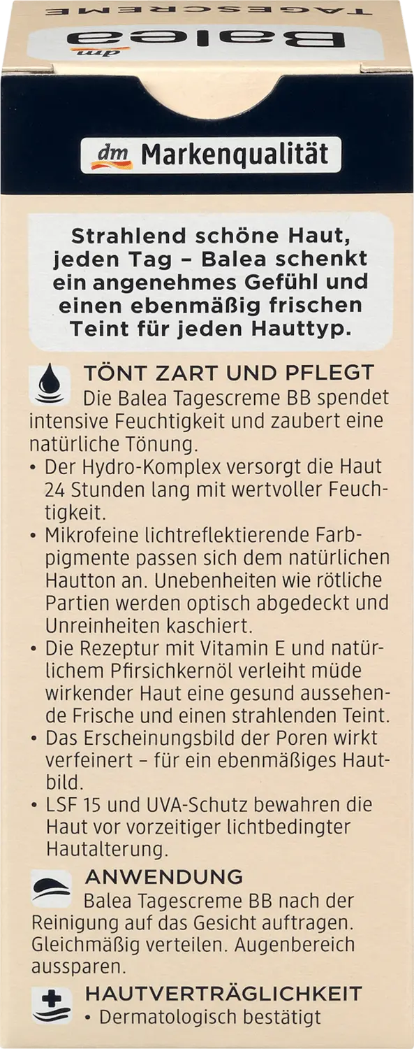 Дневной крем Balea BB светлый оттенок кожи SPF 15 обеспечивает интенсивное увлажнение и придает естественный оттенок. Микротонкие светоотражающие цветные пигменты при этом адаптируются к естественному тону кожи. Неровности, такие как красноватые участки, визуально покрываются, а загрязнения скрываются. Рецепт, содержащий витамин Е и натуральное масло семян персика, придает коже усталого вида здоровую свежесть и сияющий цвет лица. Внешний вид пор выглядит более утонченным – для ровного внешнего вида кожи. SPF 15 и защита от ультрафиолета защищают кожу от преждевременного фотостарения. Рецепт без микропластиков и водорастворимых чистых синтетических полимеров.