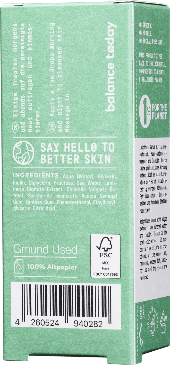 Эта защитная биосфера для вашей кожи представляет собой пре-биотическую сыворотку, которая восстанавливает баланс микробиома вашей кожи. Суть не в том, чтобы уничтожить все бактерии на вашей коже, а в том, чтобы стимулировать „хорошие“ бактерии и бороться с „плохими“. Вот что происходит с нашей сывороткой, снимающей стресс, благодаря особой комбинации активных ингредиентов со специальной морской водой, обогащенной минералами. Комплекс морского действия укрепляет и уравновешивает микробиом (кожную флору), уменьшает покраснение кожи и выравнивает уровень pH. Кроме того, он уменьшает пятна на коже и укрепляет естественный микробиологический кожный барьер. Легкая сыворотка от жирной кожи и загрязнений. Содержит экстракт морских водорослей и инулин.