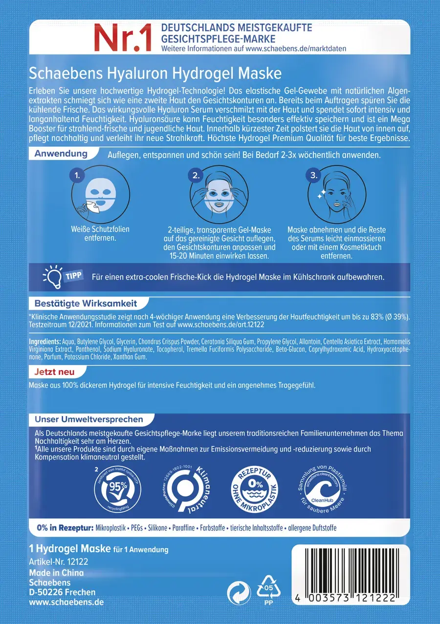 Откройте для себя маски нового поколения и испытайте инновационную гидрогелевую технологию! Эластичная гелевая ткань с натуральным экстрактом морских водорослей плотно прилегает к контурам лица, как вторая кожа. Уже при нанесении вы почувствуете прохладную свежесть. Эффективная сыворотка с гиалуроновой кислотой впитывается в кожу, мгновенно обеспечивая интенсивное и продолжительное увлажнение. Гиалуроновая кислота может особенно эффективно удерживать влагу и является мега-усилителем сияющей, свежей и молодой кожи. За очень короткое время она смягчает кожу изнутри, обеспечивает длительное питание и придает ей новое сияние. Высочайшее качество гидрогеля премиум-класса для достижения наилучших результатов.