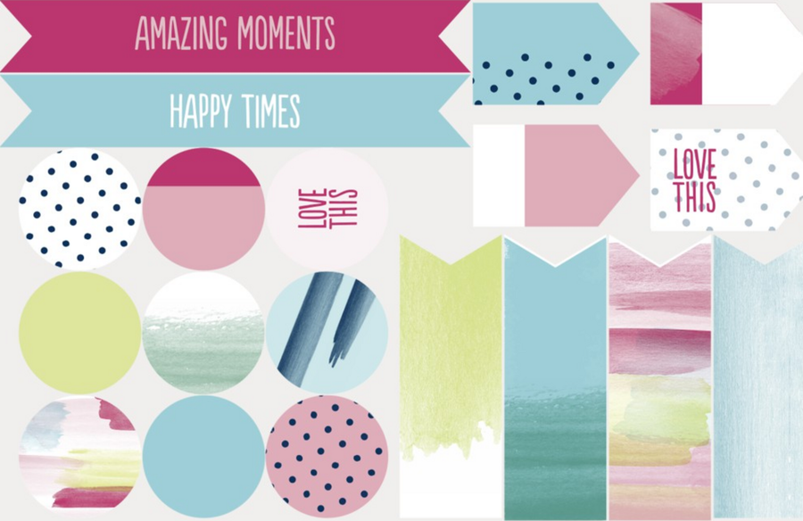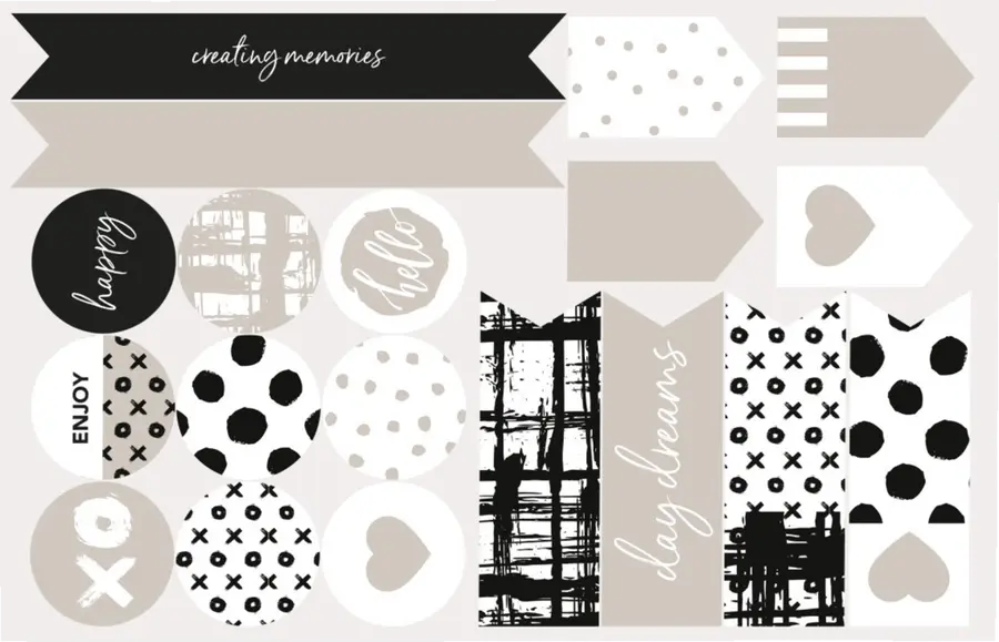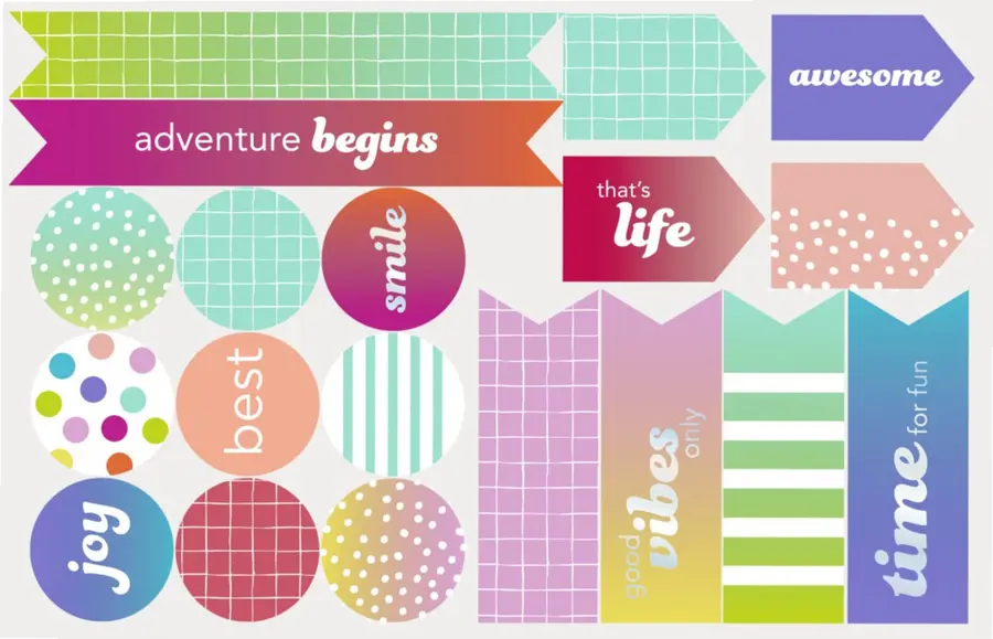 3 красочных листа с наклейками: цветные мотивы пастельных тонов, сочетающие черный / серый и яркие цвета, каждый лист содержит по 19 наклеек