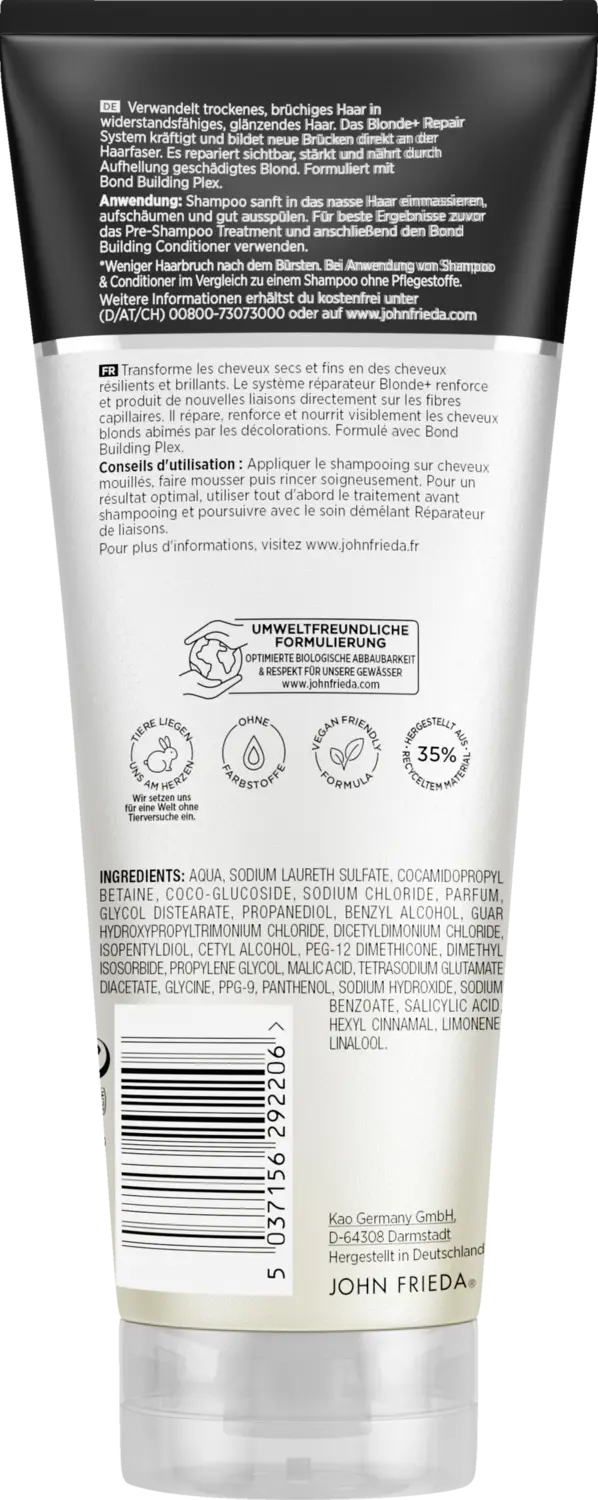 Серия СИСТЕМ ВОССТАНОВЛЕНИЯ BLONDE + превращает сухие ломкие волосы в упругие блестящие волосы - Система восстановления Blonde + заметно восстанавливает, укрепляет и питает блондинку, поврежденную осветлением - Шампунь Bond Building укрепляет и образует новые перемычки непосредственно на волокнах волос - Составлен с использованием Bond Building Plex - Экологически чистый состав - Без красителей - Vegan friendly Formula - Изготовлен из 35% переработанного материала. Более трех десятилетий назад бренд John Frieda начал свою деятельность с открытия салона на Нью-Кавендиш-стрит в Лондоне. Сегодня видение бренда отражает наследие этого салона: предоставление продуктов, ориентированных на конкретные проблемы стиля, для получения результатов салонного уровня, которые можно увидеть и почувствовать.