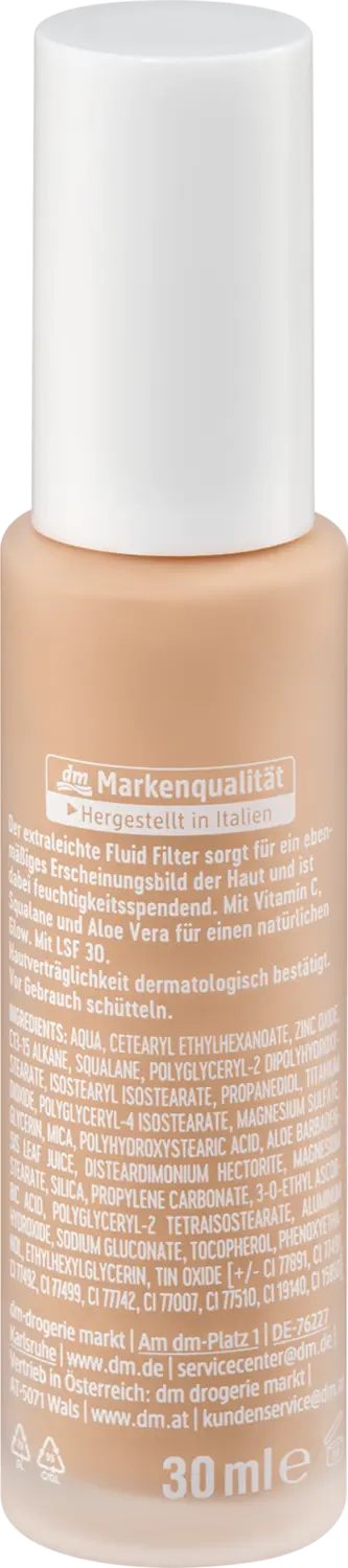 Сверхлегкая основа для фильтрации жидкости цвета 010 Cool Sand от trend !t up придает коже ровный вид, сохраняя при этом увлажняющий эффект. С витамином С, скваланом и алоэ вера создается естественное свечение. Благодаря SPF 30 макияж одновременно защищает от воздействия солнечных лучей, а его переносимость кожей подтверждена дерматологами. Эта статья выпускается в нескольких вариантах исполнения. К сожалению, предварительный выбор конкретного исполнения невозможен в этом заказе.