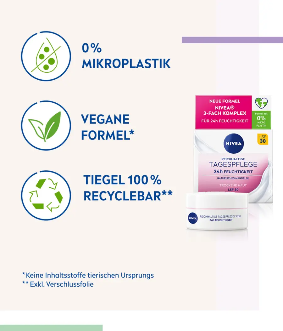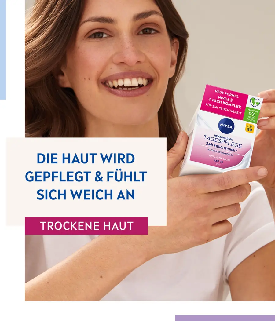 Кожная совместимость подтверждена дерматологически. Дневной уход с SPF 30 также защищает кожу от фотостарения: НАСЫЩЕННЫЙ ДНЕВНОЙ УХОД NIVEA 24 часа УВЛАЖНЯЮЩИЙ SPF 30. Попробуйте также ПИТАТЕЛЬНЫЙ крем для умывания и тоник для лица NIVEA, которые станут дополнением к вашему распорядку ухода за кожей. Вечером вы можете использовать средство для ухода за телом на ночь REGENERATION.