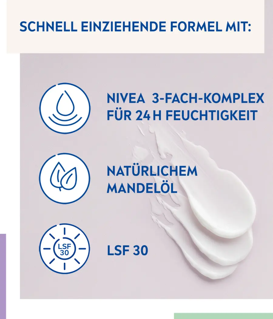NIVEA НАСЫЩЕННЫЙ ДНЕВНОЙ УХОД 24h УВЛАЖНЯЮЩИЙ SPF 30 предназначен для интенсивного ухода за сухой кожей. Формула с 3-кратным комплексом NIVEA и натуральным миндальным маслом обеспечивает увлажнение до 24 часов, тем самым уравновешивая естественный уровень увлажнения кожи. Крем интенсивно ухаживает за кожей, придавая коже нежность и защищая ее от внешних воздействий.