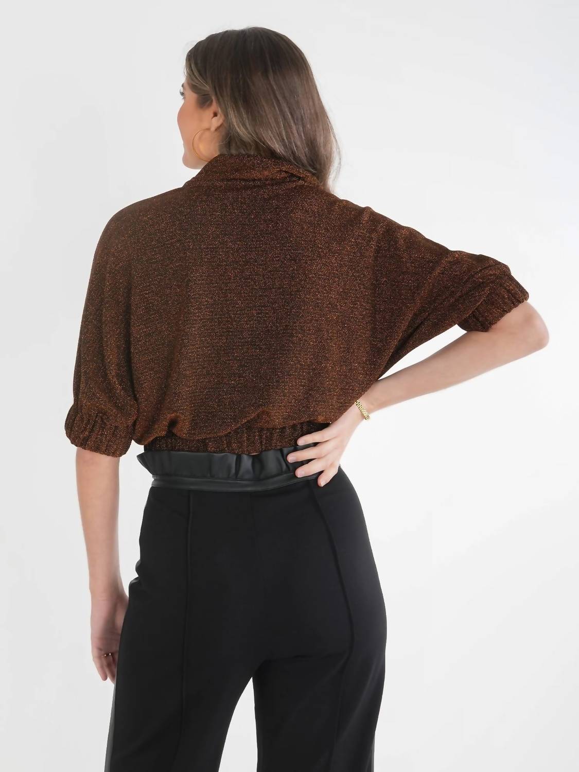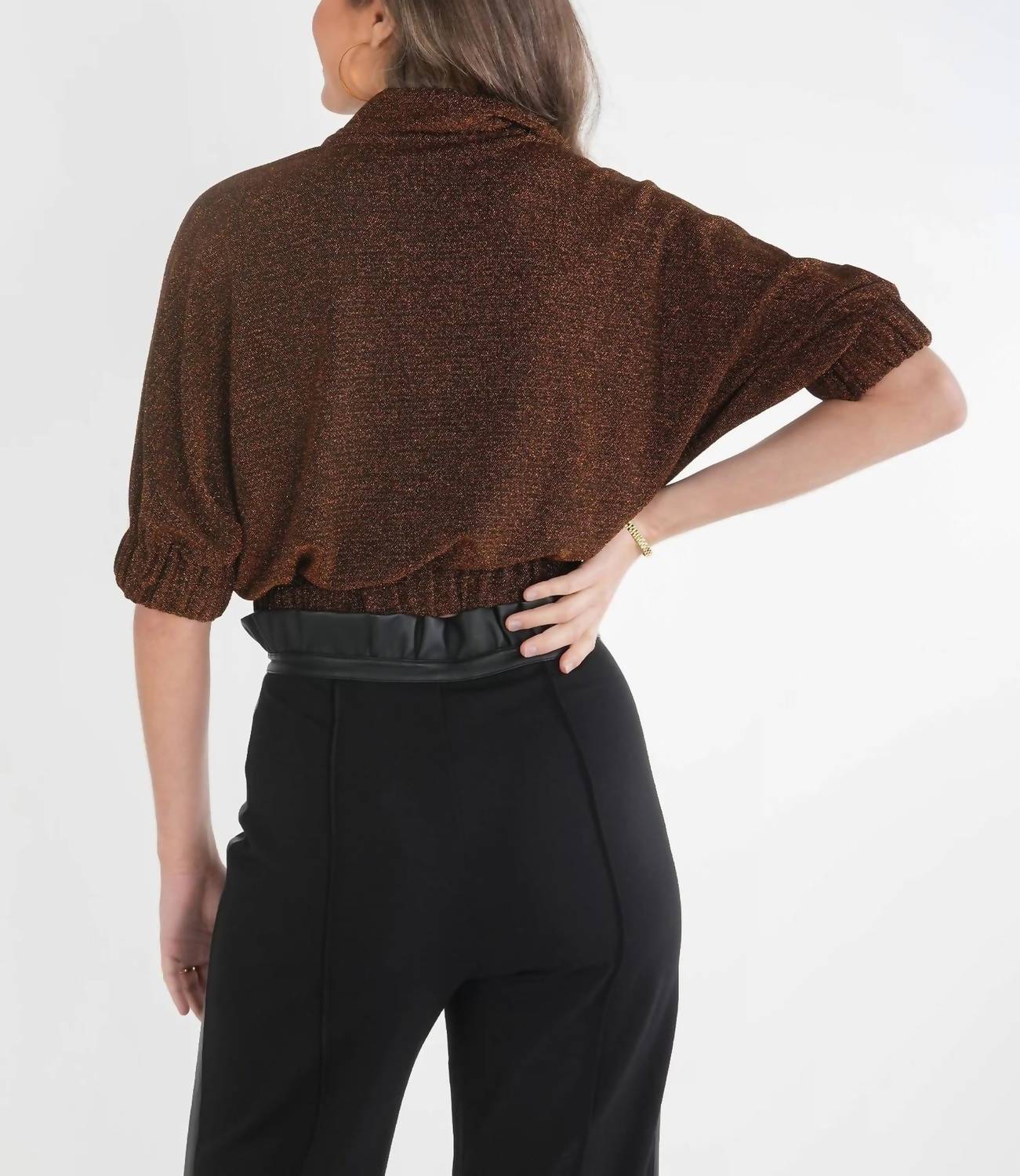 Создан для элегантности и стиля. Топ Black Gold поставляется с рукавами до локтя и застежкой-липучкой. Великолепная смесь 81% нейлона, 15% металлика и 4% спандекса для роскошной драпировки. С классическим воротником-стойкой и вырезом горловины. Предлагает текстурированный вид. Эластичный укороченный пояс обеспечивает красивую посадку. Ухаживайте за этим изделием, стирая его на деликатном режиме с мягким моющим средством в холодной воде и вывешивая для сушки.