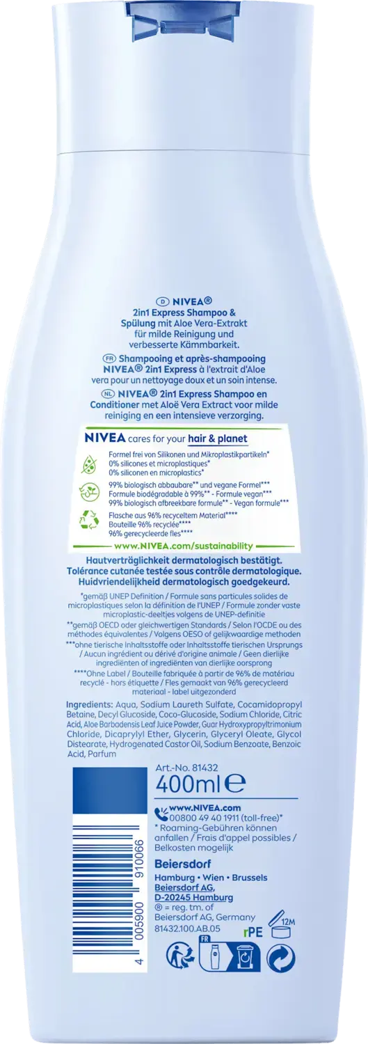 Шампунь и кондиционер NIVEA 2in1 Express для ухода за волосами мгновенно придает волосам естественный блеск. Формула для ухода за волосами 2в1 с оптимизированным уровнем pH, содержащая сыворотку с алоэ вера и блеском NIVEA, обеспечивает интенсивный уход за волосами. Кроме того, формула работает в соответствии с естественным уровнем pH волос и кожи головы. В результате кондиционер 2в1 обеспечивает здоровье волос и бережное очищение кожи головы. Формула 2в1 Уход Экспресс также на 99% биоразлагаема в соответствии с ОЭСР или эквивалентными стандартами, веганская, полностью не содержит ингредиентов животного или животного происхождения, не содержит силиконов, твердых микропластических частиц (согласно определению ЮНЕП), а бутылка (без крышки и этикетки) изготовлена из 96% переработанного материала.