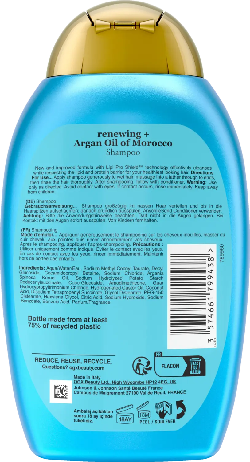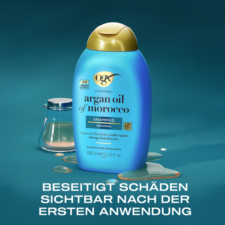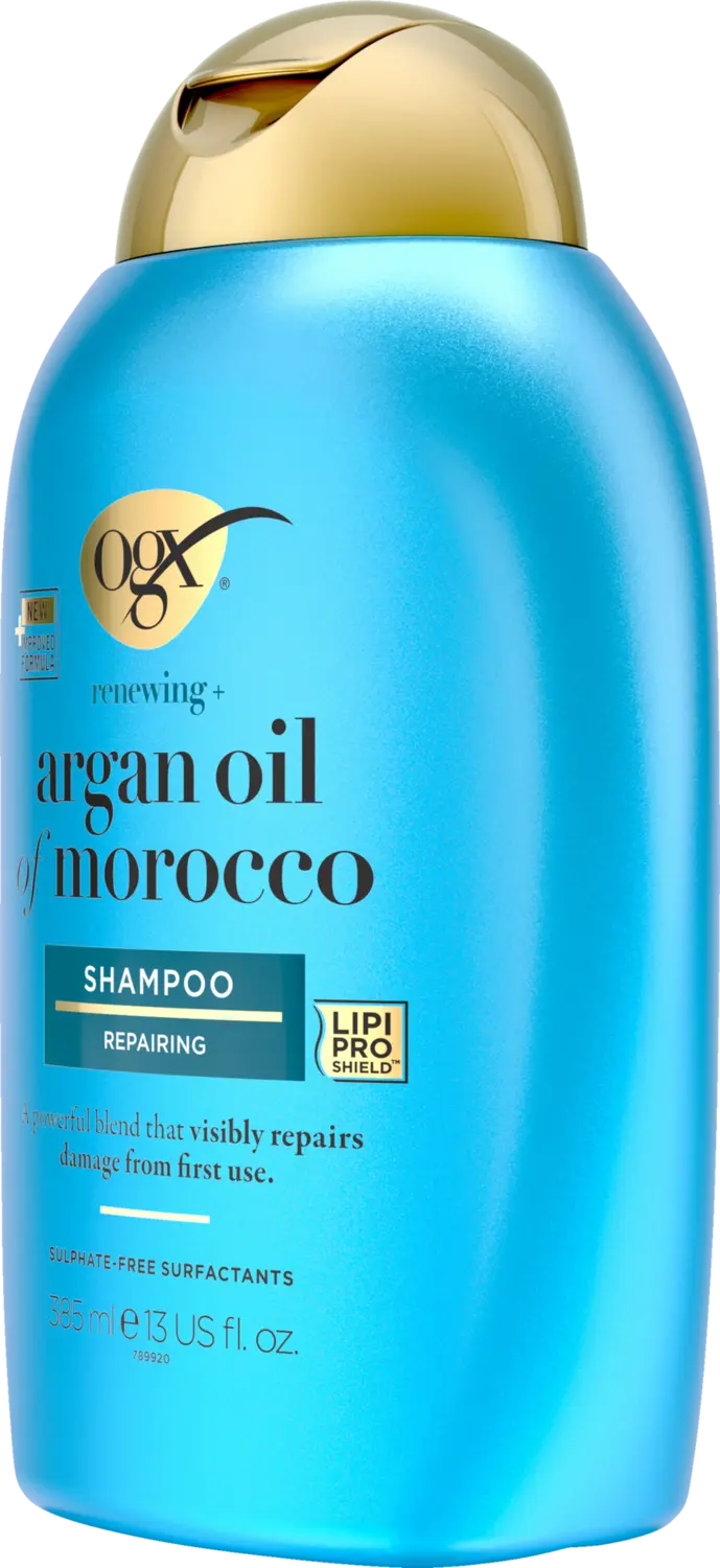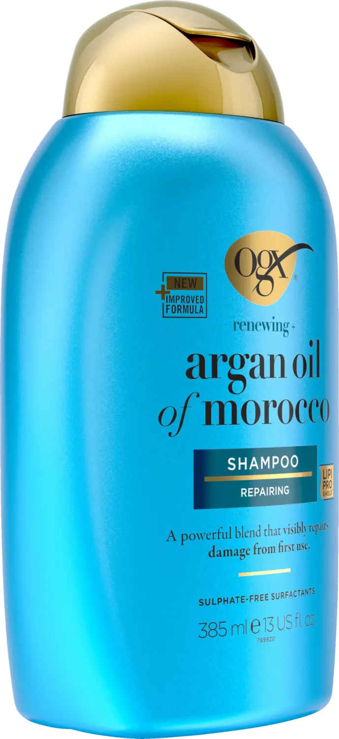Восстанавливающий шампунь OGX Renewing Argan Oil of Morocco с ценным марокканским аргановым маслом укрепляет и питает волосы. Кроме того, шампунь для ухода за волосами обеспечивает интенсивное увлажнение волос. Кроме того, шампунь с УФ-защитой эффективно защищает сухие и поврежденные волосы от повреждений, вызванных тепловой укладкой (феном, утюжком и т. Д.) И ультрафиолетовыми лучами. Шампунь с аргановым маслом, не содержащий сульфатсодержащих поверхностно–активных веществ, делает волосы сильными, эластичными и блестящими.