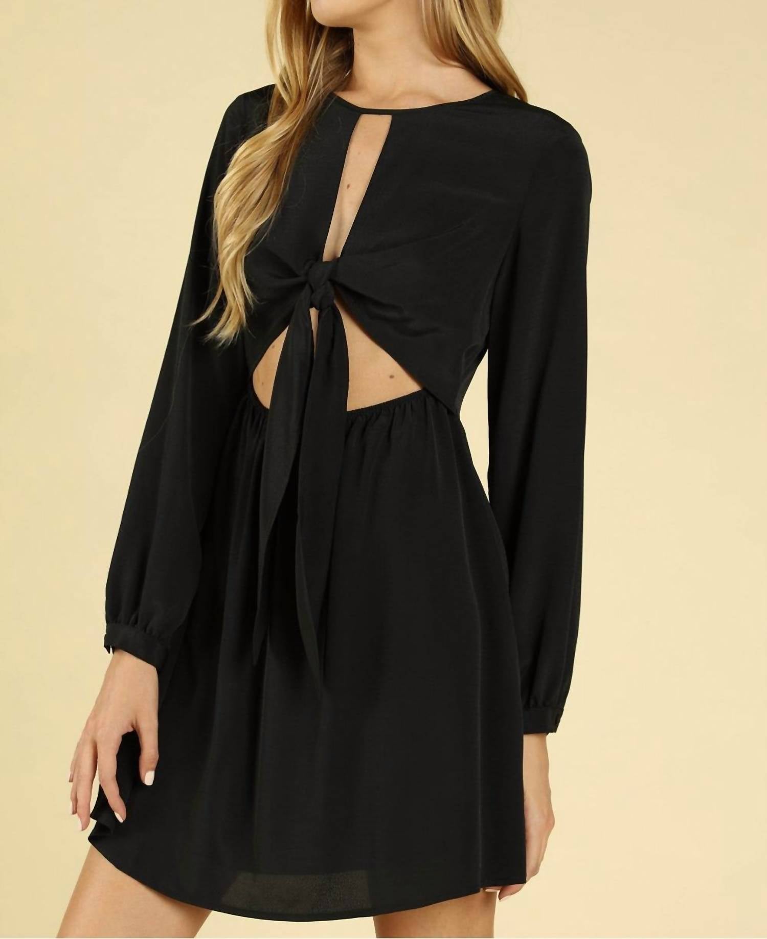 Короткое и воздушное платье для теплых дней. Появитесь в платье Start the Party от Honey Punch, созданном для тех, кто любит непринужденный стиль в сплошном черном цвете. Это мини-платье А-силуэта с длинными рукавами, круглым вырезом с отделкой в ​​виде замочной скважины и шикарным вырезом на талии, дополненным изысканным передним завязкой. Изготовленное из 100% полиэстера с подкладкой из вискозы, оно обеспечивает комфорт и легкость движений. Застежка - сдержанная застежка-молния сзади. Доступные размеры с обхватом груди - Small 34", Medium 36", Large 38"; Длина 33"-34".
