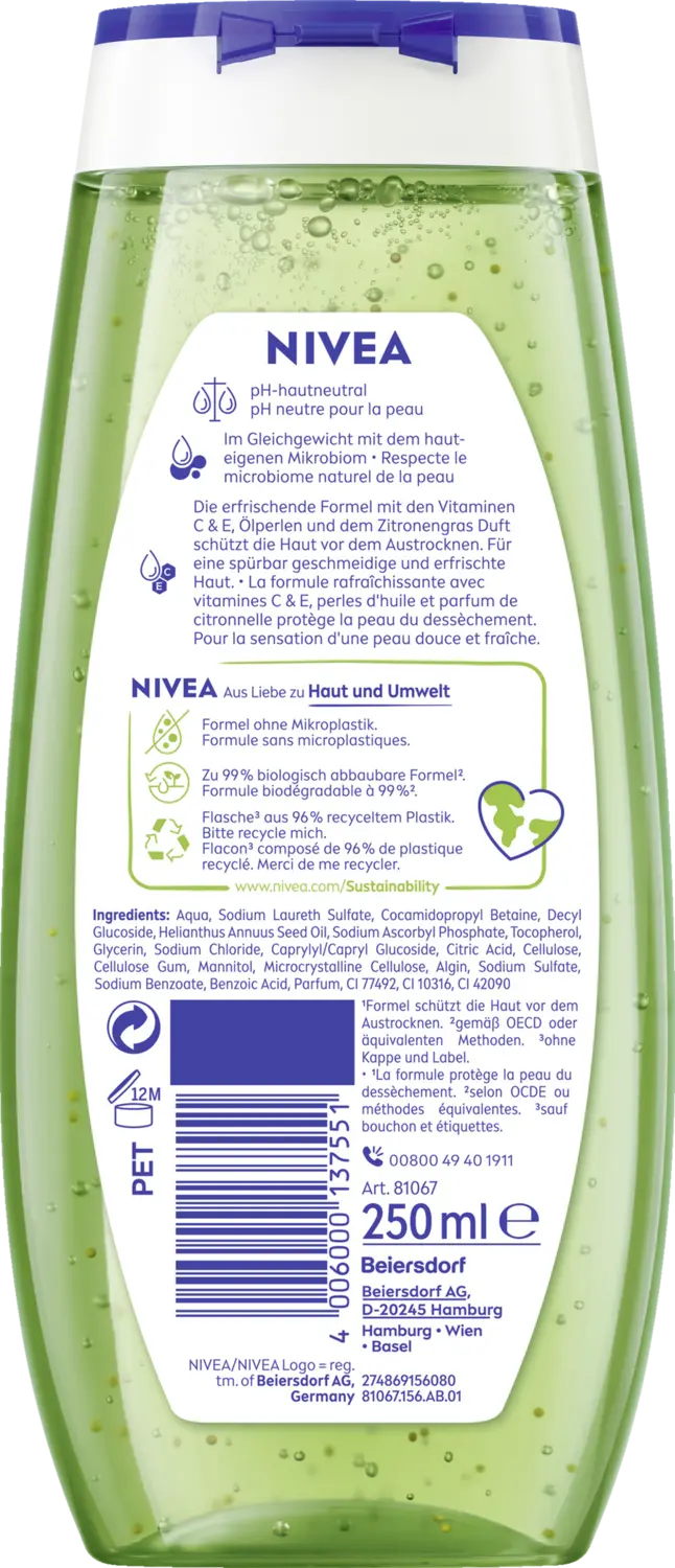 Этот питательный душ полезен не только для вашей кожи, но и для окружающей среды: бутылка на 96% изготовлена из переработанного материала, за исключением крышки и этикетки. Кроме того, формула не содержит микропластиков и на 99% биоразлагаема (в соответствии с ОЭСР или эквивалентными методами). Превратите каждый прием душа в приятный момент ухода с помощью геля для душа NIVEA: Lemongrass & Oil.