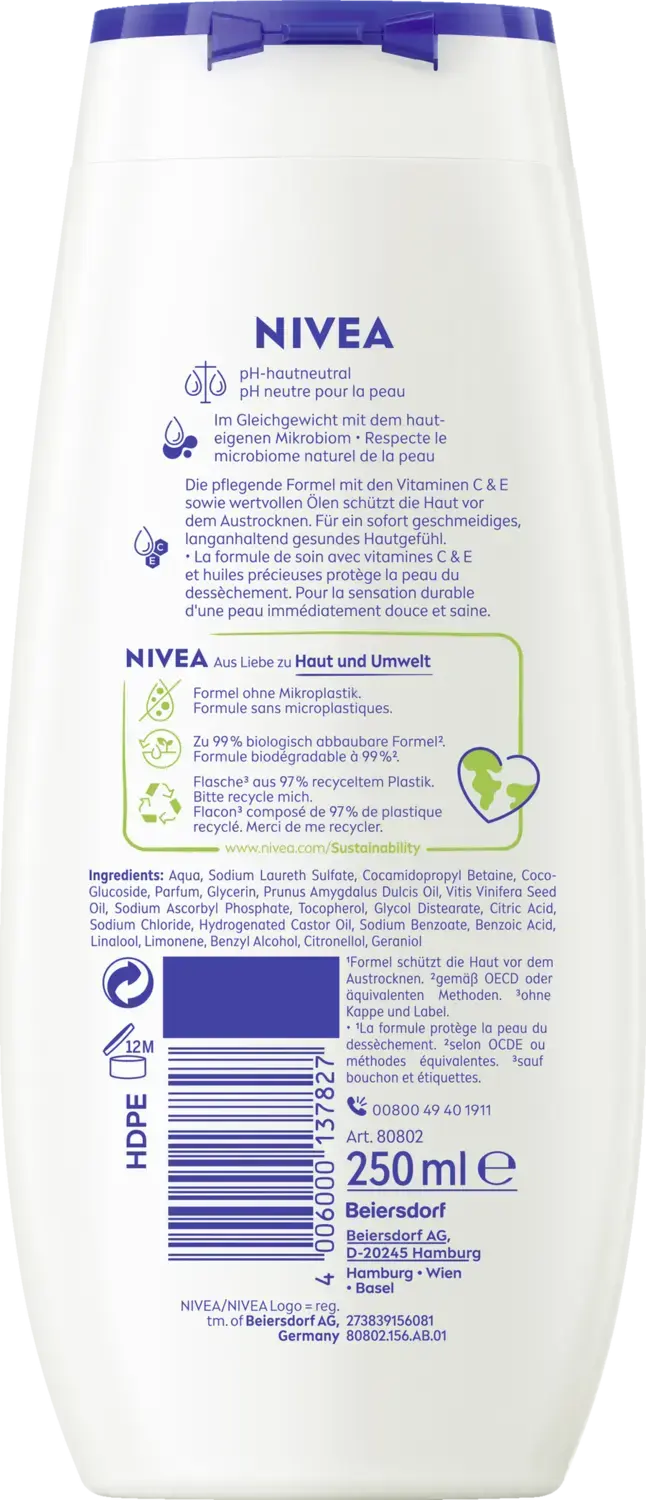 Откройте для себя ощущение упругости кожи с помощью мягкого кондиционирующего душа NIVEA Cream. Почувствуйте, как шелковистый гель для душа мягко питает вашу кожу в душе благодаря своей формуле, содержащей натуральное миндальное масло, масла и витамины С и Е. Наслаждайтесь бархатистой, кремовой пеной и нежным ароматом.