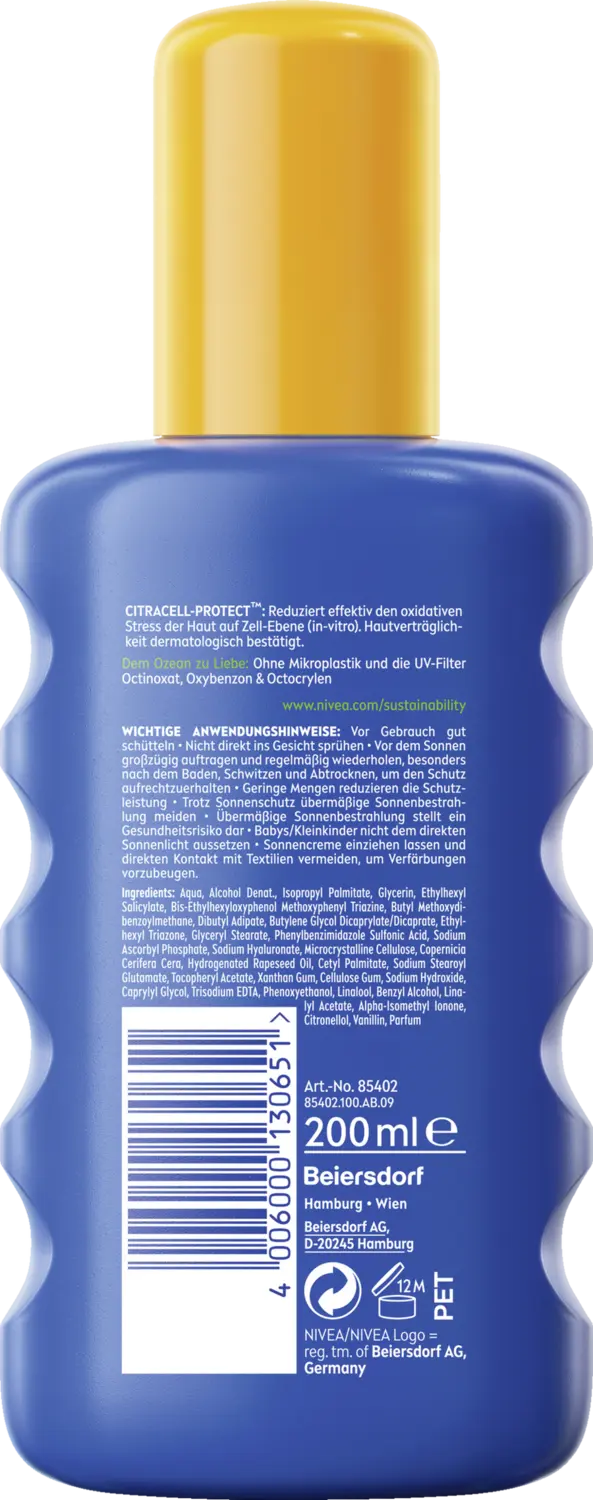 Солнцезащитный спрей NIVEA SUN Protection & Care Spray SPF 30 мгновенно и очень эффективно защищает от ультрафиолетового и ультрафиолетового излучения, солнечных ожогов и преждевременного старения кожи. Кроме того, питательная и водостойкая формула предотвращает высыхание кожи и сохраняет ее увлажненной в течение 48 часов. Формула также содержит 5% чистого глицерина, натурального увлажняющего средства, которое защищает кожу от высыхания. Солнцезащитный спрей работает в равновесии с собственным микробиомом кожи, естественным бактериальным слоем, который формирует защитную систему кожи. Кожная совместимость NIVEA SUN Protection & Care SPF 30 подтверждена дерматологами. Компания NIVEA SUN поставила перед собой цель минимизировать воздействие на окружающую среду. Что касается океана, формула солнцезащитного спрея SPF 30 не содержит загрязняющих УФ-фильтров октокрилена, октиноксата и оксибензона, а также не содержит микропластиков. Надежная защита в солнечные дни: Солнцезащитный спрей NIVEA SUN Protection & Care SPF 30.