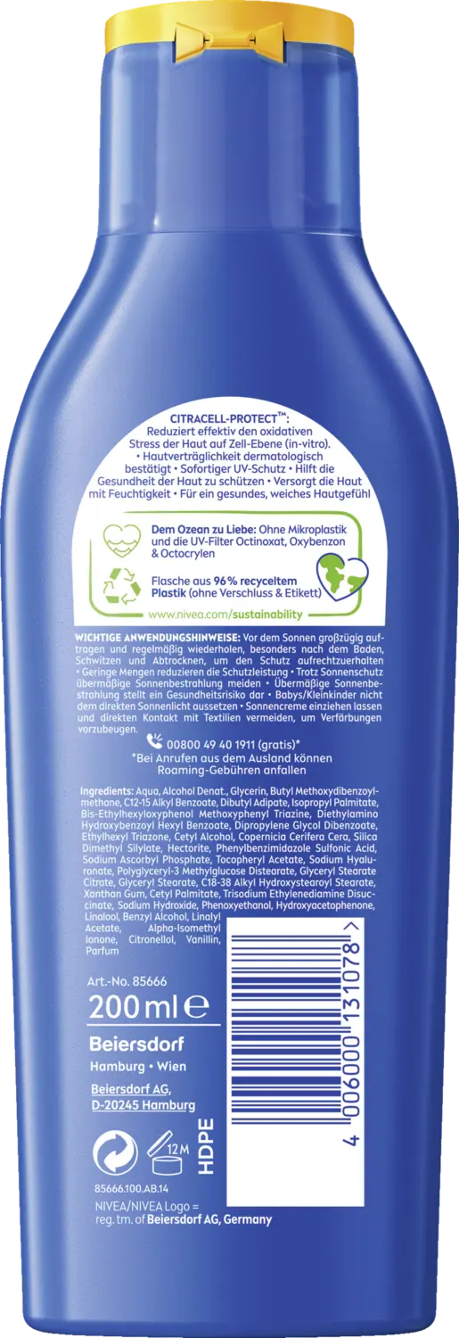 Солнцезащитный лосьон NIVEA для защиты от солнца и ухода с добавлением CitraCell-Protect и витамина С и гиалурона. Новая формула работает не только с УФ-фильтрами, помогая коже создать второй защитный барьер и эффективно снижая окислительный стресс на клеточном уровне. Кроме того, новая формула восстанавливает влажность кожи в течение 48 часов, обеспечивая здоровое и мягкое ощущение кожи.