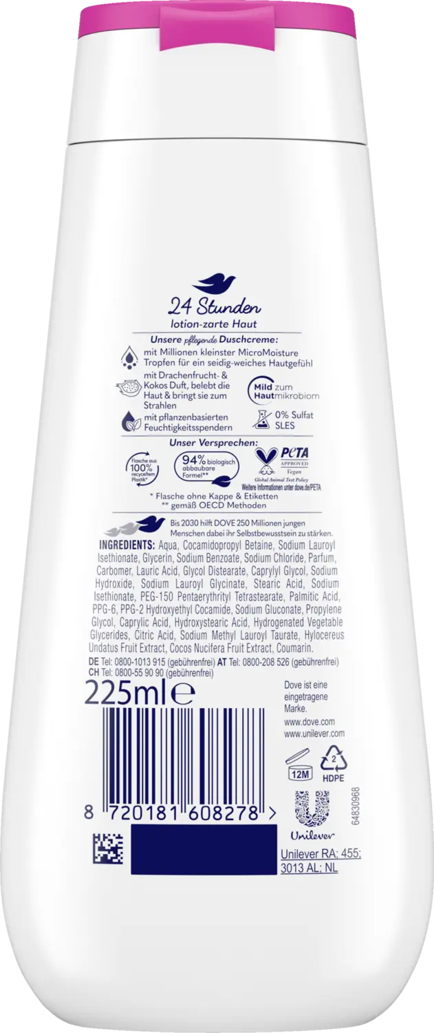 Гель для душа и умывания оставляет ощущение мягкости и эластичности кожи уже после первого душа, расслабляя сухую кожу. К этому добавляется крем для душа с чувственным ароматом драконьего фрукта и кокоса. Нанесите на руку немного бодрящего крема для душа и взбейте до кремообразной консистенции. Нанесите кремообразную пену для душа на тело, особенно на те участки, которые нуждаются в небольшом дополнительном уходе. Затем просто смойте и наслаждайтесь ощущением мягкости и эластичности кожи. Бутылка изготовлена на 100% из переработанного пластика *.