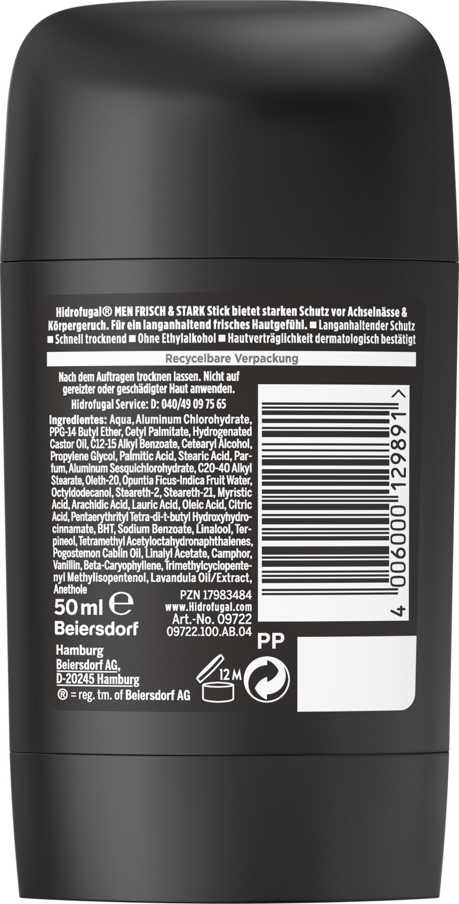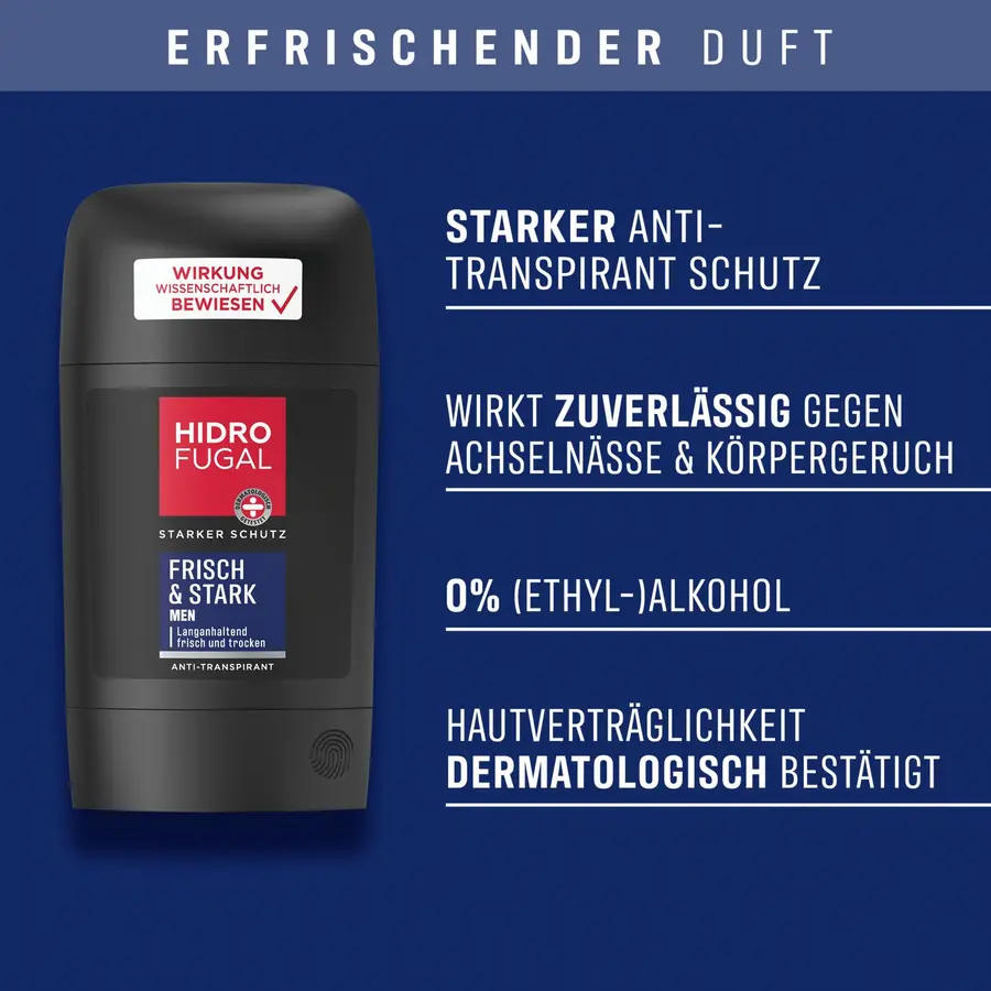 Сильная защита от подмышек и неприятного запаха тела: Дезодорант HIDROFUGAL MEN FRESH & STARK Stick обеспечивает особенно стойкое ощущение свежести и чистоты кожи благодаря специально разработанной формуле с мужским свежим ароматом. Антиперспирантная дезодорантная палочка с научно доказанным эффектом быстро впитывается в кожу и обеспечивает ощущение сухости под мышками уже вскоре после нанесения. Простая в использовании и очень эффективная формула, обеспечивающая ощущение свежести и безопасности подмышек в течение всего дня. Конкретная формула не содержит этилового спирта, а ее кожная совместимость была проверена дерматологами.