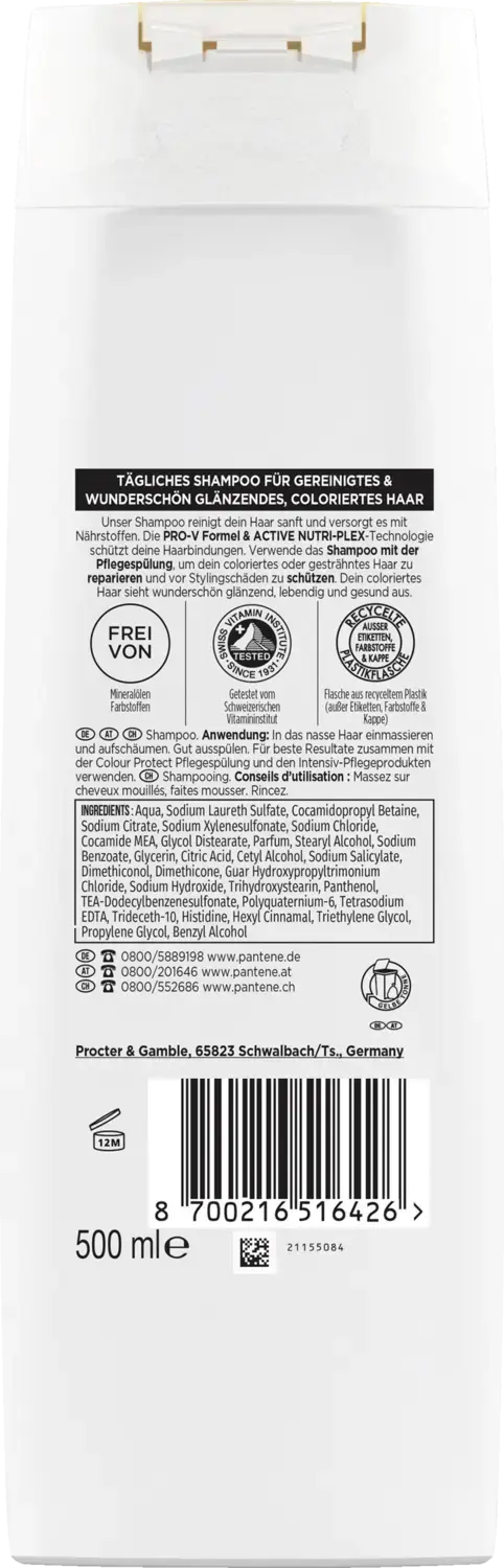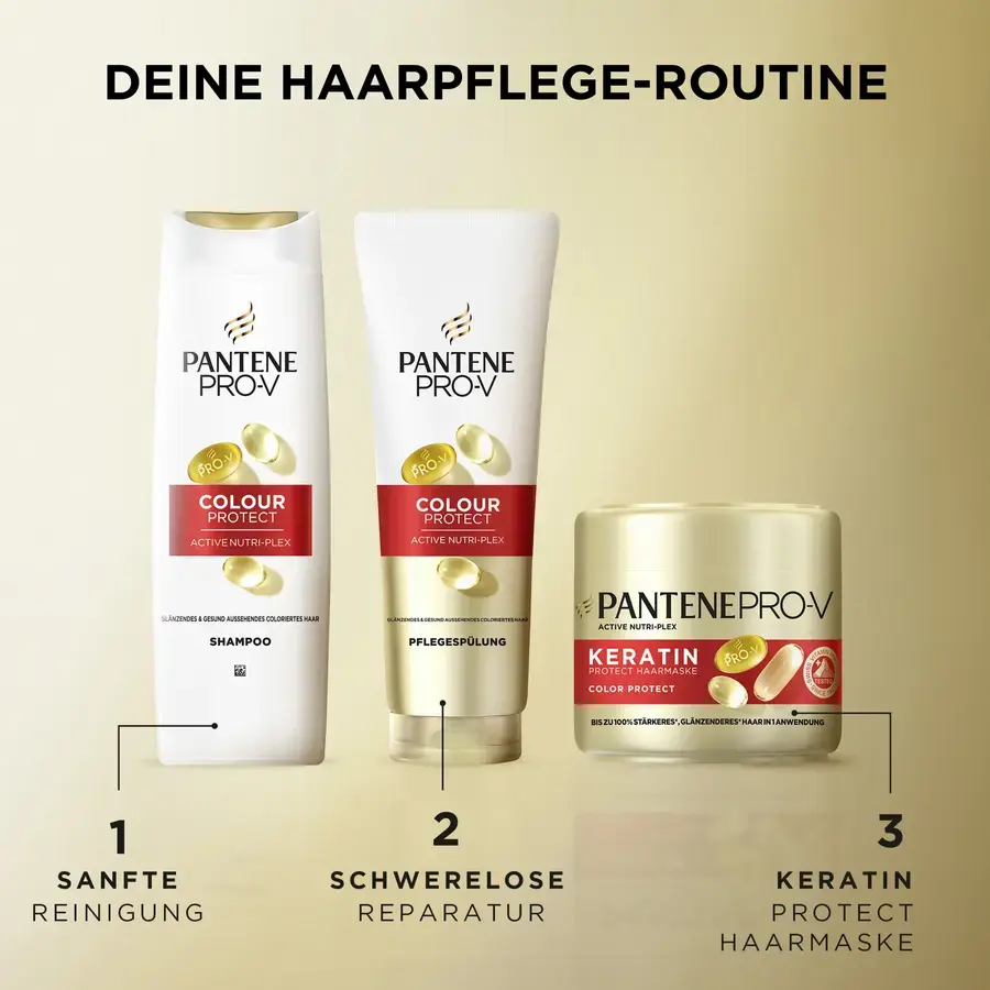 Откройте для себя шампунь Pantene Pro-V Colour Protect - идеальный уход за яркими, здоровыми окрашенными и уложенными волосами. Его нежная формула с PRO-V и инновационной технологией ACTIVE NUTRI-PLEX очищает волосы и обеспечивает их необходимыми питательными веществами. Наряду с кондиционирующим кондиционером, он помогает восстановить окрашенные или спутанные волосы и защитить их от повреждений при укладке. Протестировано Швейцарским институтом витаминов. Получите максимальное удовольствие от ухода за волосами с помощью шампуня Pro-V Active Nutri-Plex Color Protect.