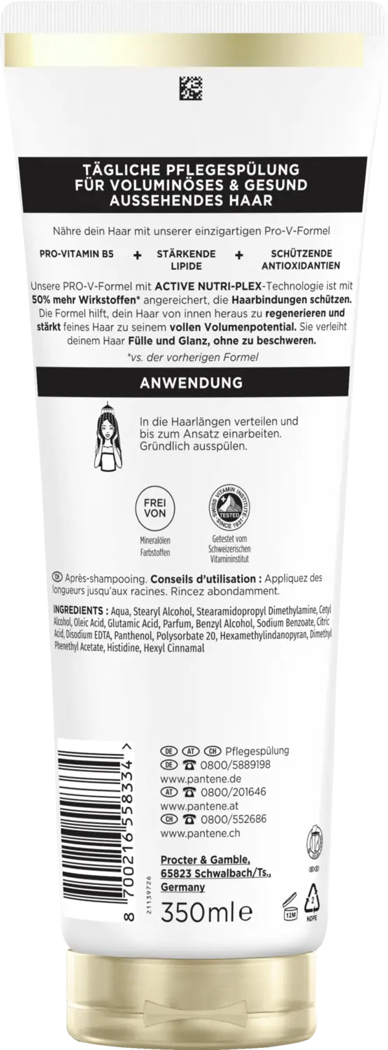 Откройте для себя кондиционер для ухода за волосами Pantene Pro-V Volume, ваш ежедневный партнер по уходу за волосами. Питайте волосы уникальной формулой PRO-V, которая представляет собой мощную комбинацию провитамина B5, укрепляющих липидов и защитных антиоксидантов. Технология ACTIVE NUTRI-PLEX обогащена на 50% большим количеством активных ингредиентов *, которые защищают ваши волосы, укрепляют их и помогают укрепить волосы изнутри. Протестировано Швейцарским институтом витаминов. Получите максимальное удовольствие от ухода за волосами с помощью кондиционирующего кондиционера Pro-V Active Nutri-Plex Volume, который придаст вашим тонким волосам объемный и здоровый вид.