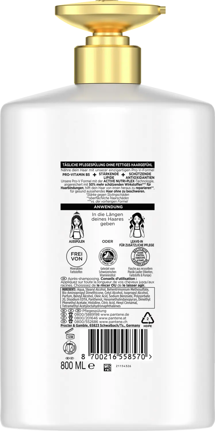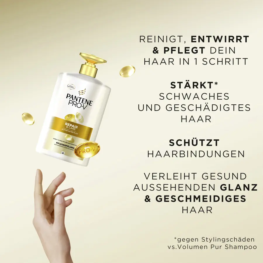 Откройте для себя кондиционер для ухода за волосами Pantene Pro-V Repair & Care, ваш ежедневный партнер по уходу за волосами. Ваш ежедневный, невесомый кондиционер, который не смазывает жир. Обеспечьте волосы уникальной формулой PRO-V, которая представляет собой мощное сочетание провитамина B5, укрепляющих липидов и защитных антиоксидантов. Обогащенная технологией ACTIVE NUTRI-PLEX, инновационная формула, содержащая на 50% больше активных ингредиентов *, которые защищают волосы, помогает восстановить волосы изнутри ** и придать им здоровый вид. Протестировано Швейцарским институтом витаминов. Кондиционер для ухода поставляется в бутылке, пригодной для вторичной переработки (за исключением дозаторов помпы, красителей и этикеток). Получите максимальное удовольствие от ухода за волосами с помощью кондиционера Pantene Pro-V Active Nutri-Plex Repair & Care и наслаждайтесь процедурой, которая сделает ваши волосы красивыми и легкими без особых усилий.