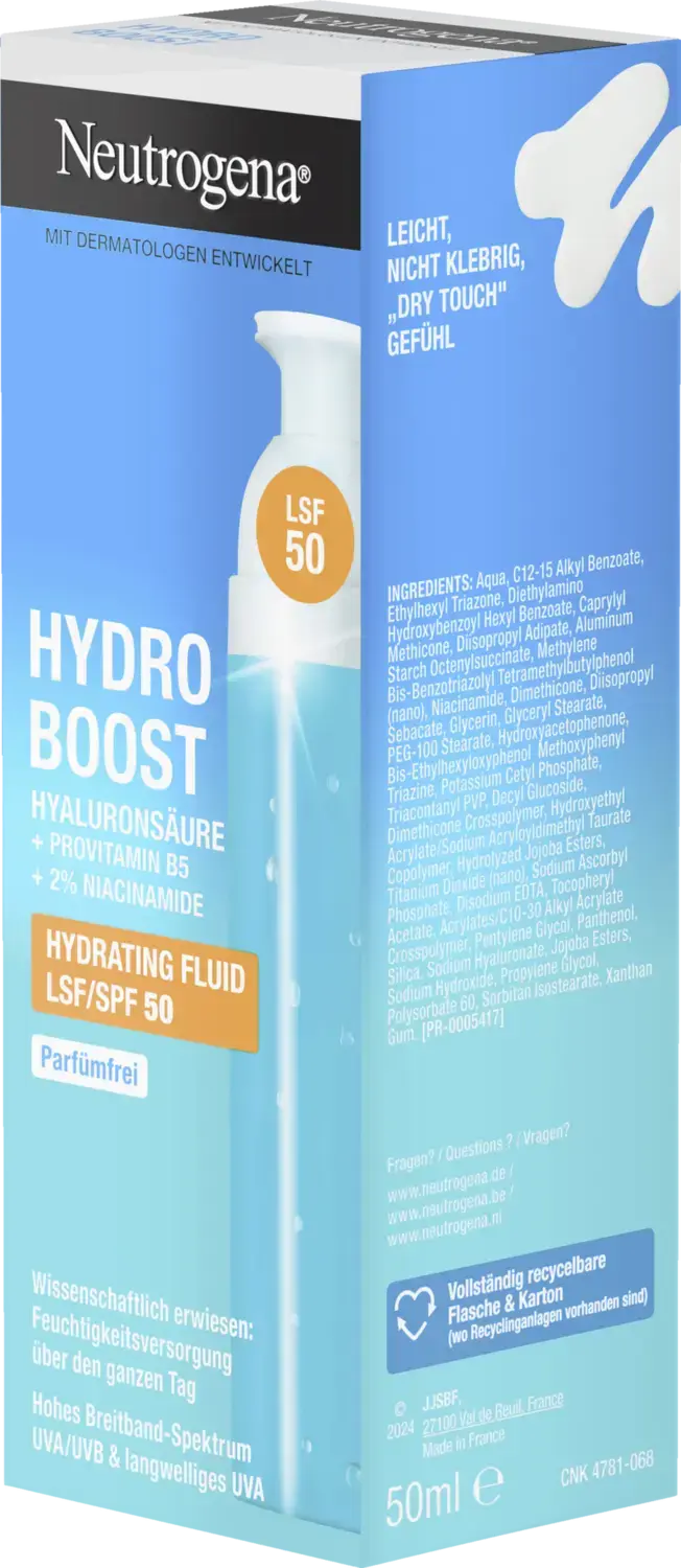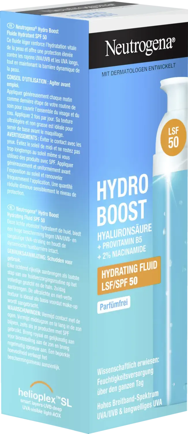 Neutrogena Hydro Boost Aqua Fluid – Интенсивное увлажнение и комплексный солнцезащитный крем С защитой широкого спектра действия от ультрафиолетовых и ультрафиолетовых лучей и уникальной формулой, которая сохраняет вашу кожу увлажненной в течение всего дня, Neutrogena Hydro Boost Aqua Fluid обеспечивает все необходимое вашей коже в течение дня. Крем для лица без отдушек и некомедогенный, укрепляет защитный барьер кожи и повышает баланс влаги. Содержащаяся в нем гиалуроновая кислота связывает воду для интенсивного увлажнения, а провитамин B5 (пантенол) поддерживает водный барьер. Антиоксидантные витамины С и Е защищают от окислительного стресса, вызванного ультрафиолетом, а ниацинамид обеспечивает более ровный внешний вид кожи и уменьшает пигментные пятна. Технология Helioplex обеспечивает надежную защиту от солнца.