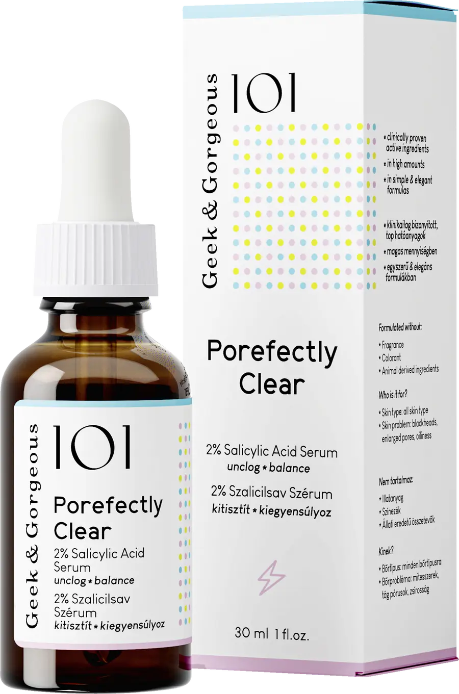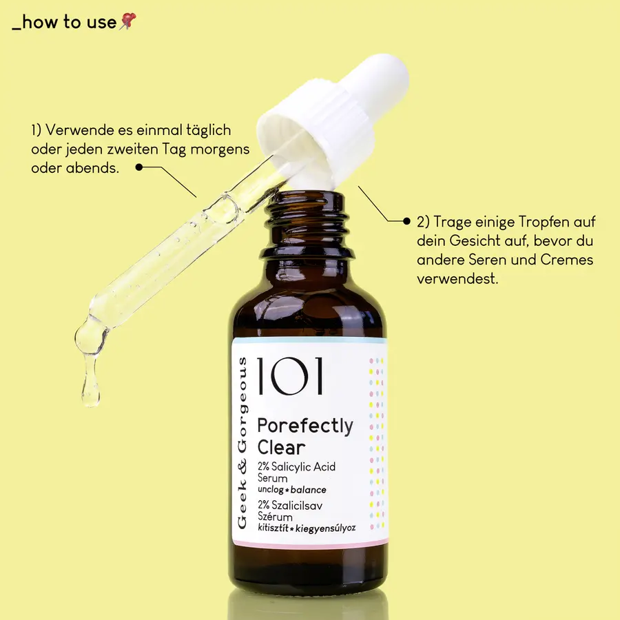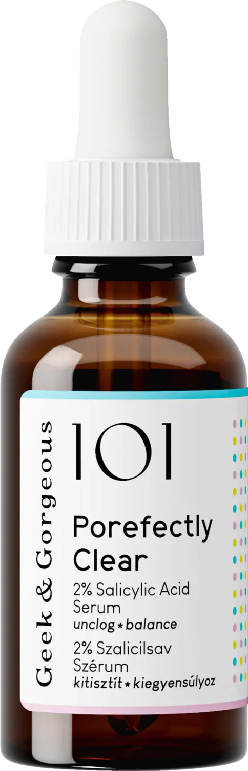 Средство Porefectly Clear от Geek & Gorgeous противодействует избыточному выделению кожного сала и сопутствующим ему явлениям. Гелеобразная сыворотка, содержащая 2% салициловой кислоты, помогает очистить поры и бороться с угрями. Салициловая кислота (КНБК) считается хорошо известным активным веществом, отшелушивающим кожу до глубоких пор. Сыворотка подходит для жирной и склонной к загрязнениям кожи.