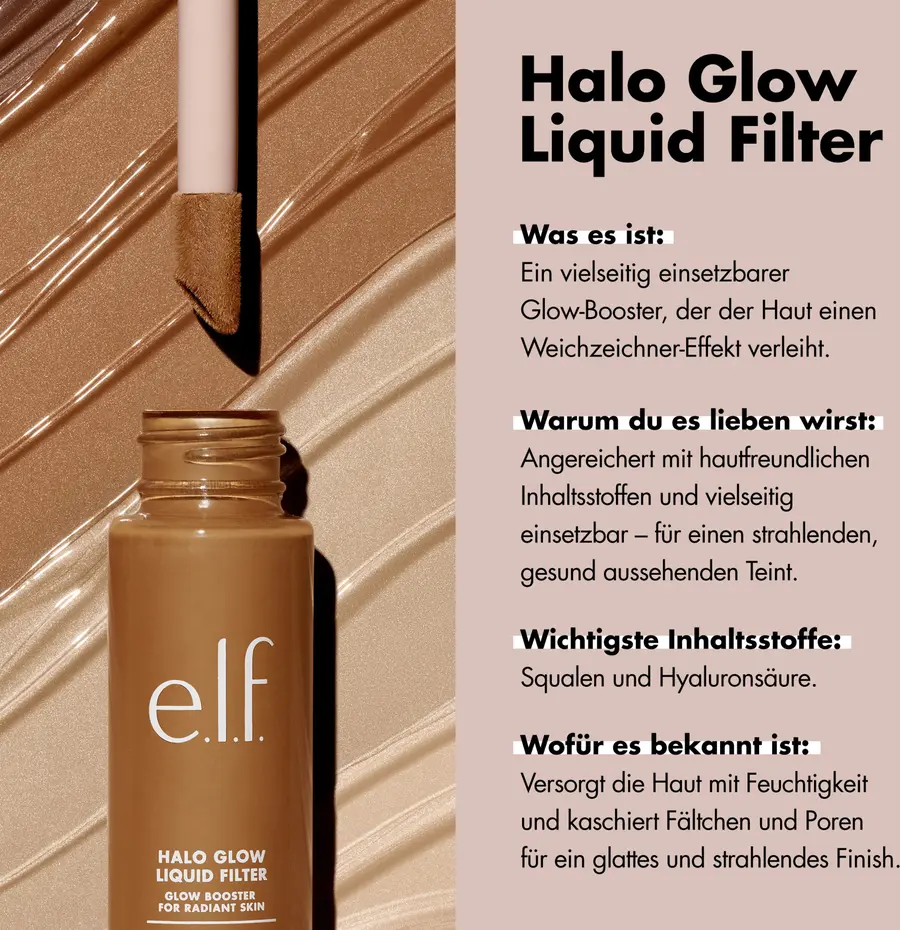 e.l.f. прислушалась к вашим пожеланиям – жидкий фильтр Halo Glow теперь доступен в 12 оттенках, подходящих для самых разных тонов и оттенков кожи! Этот инновационный гибрид средства для улучшения цвета лица и ухода за кожей содержит сквалан и гиалуроновую кислоту. Уникальная формула улучшает внешний вид кожи, обеспечивая при этом сияющий эффект мягкого фокуса. Носите их отдельно, под или поверх макияжа, смешивайте с вашей любимой основой для придания розового оттенка или используйте в качестве маркера, чтобы подчеркнуть выступающие участки лица.