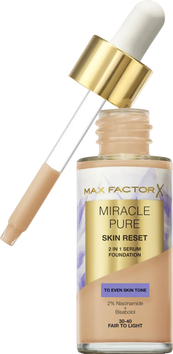 Ready. Сброс. Go – mit der Max Factor Miracle Pure Skin Reset Foundation. Формула 2-в-1 сочетает в себе питательную сыворотку и жидкую основу с балансирующим эффектом, придавая коже более ровный вид. Эффект усиливается за счет комплекса Reset с 2% ниацинамидом и бисабололом, который питает кожу и придает ей здоровое сияние. Тональный крем обеспечивает среднее покрытие с шелковисто-матовой отделкой и обеспечивает естественный сияющий цвет лица, доступный в шести оттенках. Веганская формула прошла клинические и дерматологические испытания и подходит даже для чувствительной кожи.