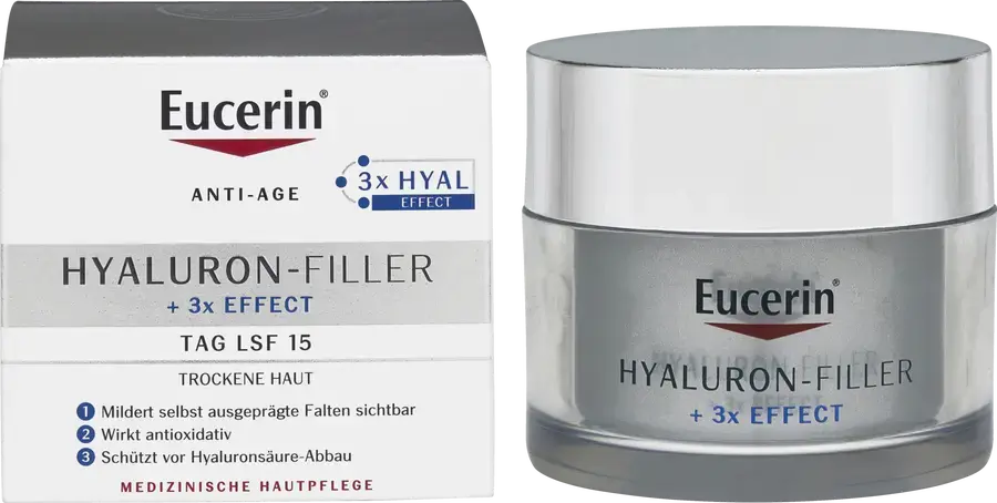 Дневной уход для сухой кожи Eucerin Hyaluron Filler + 3x Effect - это антивозрастной дневной крем с гиалуроновой кислотой, состав которого специально разработан для удовлетворения потребностей сухой кожи. Дневной крем SPF для сухой кожи содержит уникальную комбинацию длинноцепочечных и короткоцепочечных молекул гиалуроновой кислоты. Таким образом, можно заполнить даже ярко выраженные складки изнутри. Биоактивный сапонин дополнительно стимулирует естественную выработку гиалуроновой кислоты в коже. Таким образом, кожа оптимально увлажняется, а морщины разглаживаются. SPF 15 с защитой от ультрафиолета предотвращает преждевременное старение кожи, вызванное солнечными лучами, и появление морщин. Уход также отлично подходит в качестве основы для макияжа.