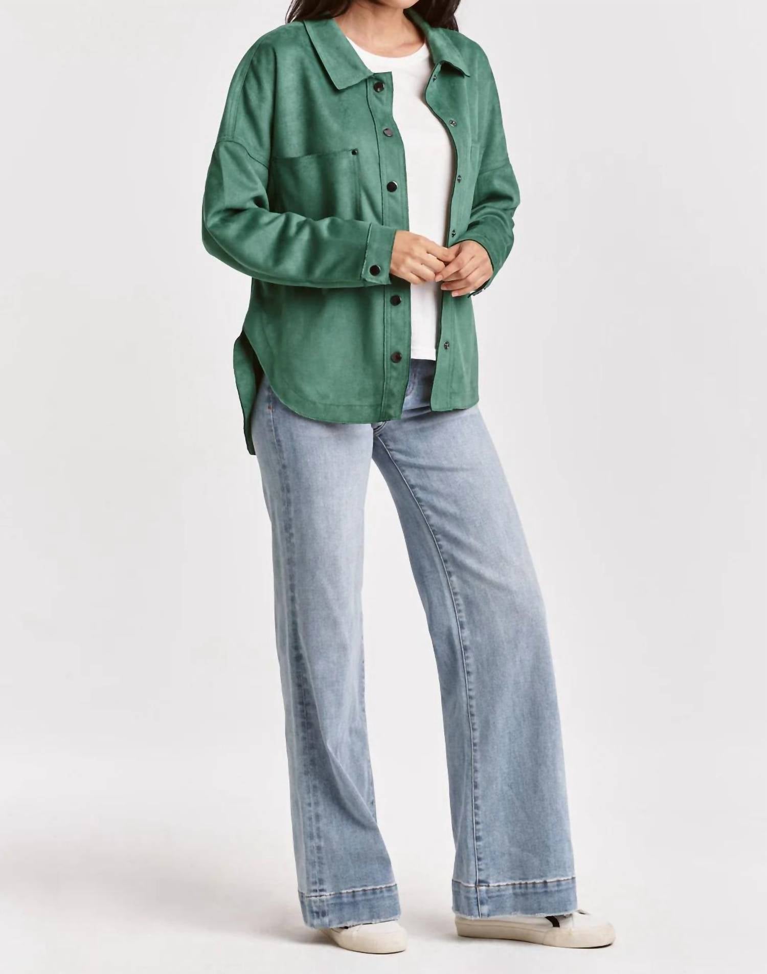 Милая, повседневная и удобная. Эта куртка просто необходима. Откройте для себя куртку-рубашку Gina Suede от DEAR JOHN DENIM, которая обязательно должна быть в нефритовом цвете для любого стильного гардероба. Эта куртка с длинными рукавами имеет застежку на пуговицы и спущенные плечи, изготовлена ​​из смеси 94% полиэстера и 6% спандекса для легкого комфорта и блеска. Воротник рубашки и передние накладные карманы добавляют изысканности к непринужденному крою, делая ее идеальной для любого случая. Идеально подходит для женщин, ищущих повседневный, но изысканный образ.