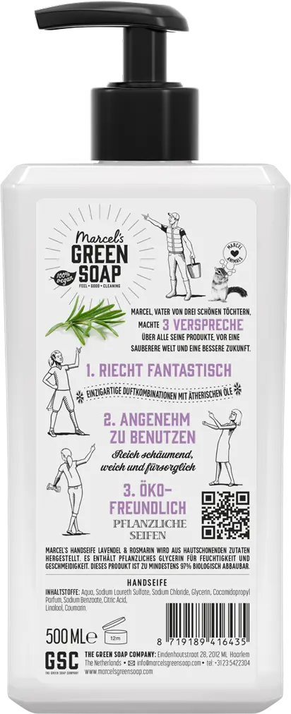 Мыло для рук Marcel's изготовлено из полезных для кожи ингредиентов. Он содержит растительный глицерин для увлажнения и эластичности. Этот продукт на 97% биоразлагаем, на 100% веганский, а бутылки на 100% изготовлены из переработанного пластика.