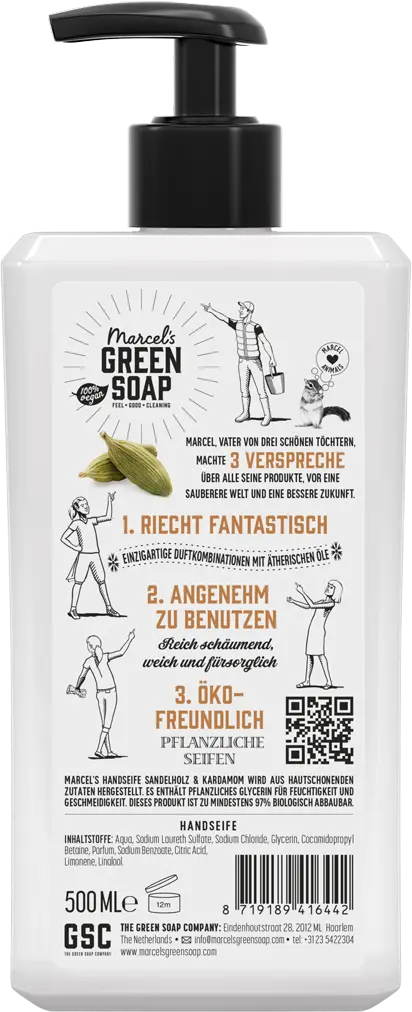 Мыло для рук Marcel's изготовлено из полезных для кожи ингредиентов. Он содержит растительный глицерин для увлажнения и эластичности. Этот продукт на 97% биоразлагаем, на 100% веганский, а бутылки на 100% изготовлены из переработанного пластика.