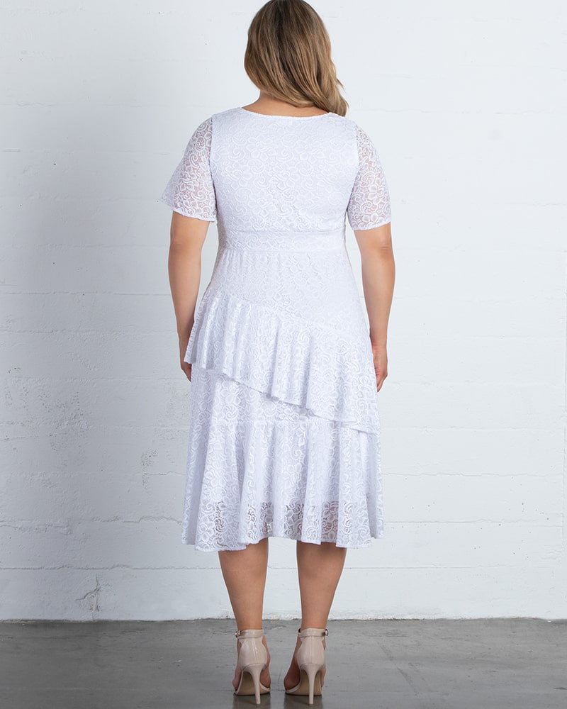 Мы любим кокетливые маленькие белые платья. Наше платье Harmony Lace Dress больших размеров имеет V-образный вырез, короткие рукава-крылышки и привлекательную юбку А-силуэта с оборкой по подолу. Асимметричная юбка-волан посередине добавляет много движения и стиля. Идеально подходит для особых случаев, девичников, репетиционных ужинов и неформальных свадеб. Изготовлено исключительно в женских размерах plus.