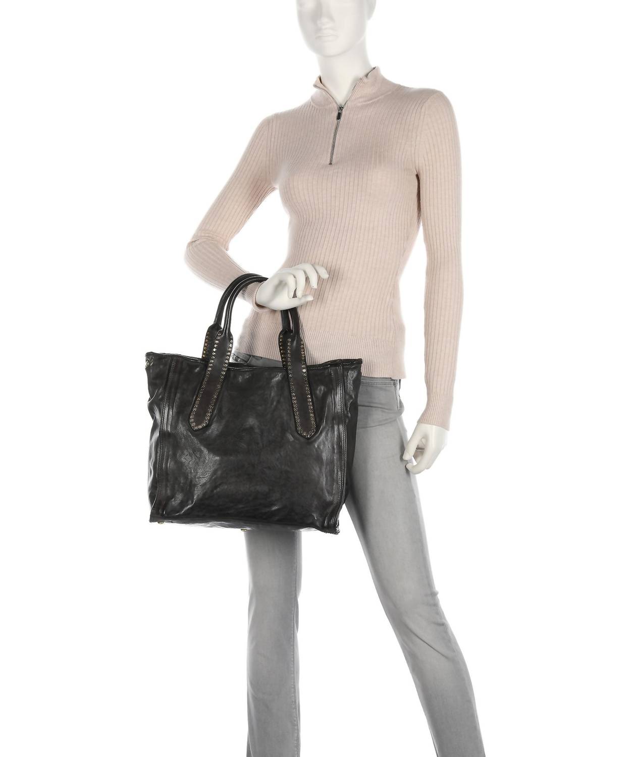 Эта сумка для покупок изготовлена из коровьей кожи и имеет защитные металлические ножки и фурнитуру в винтажном стиле золотистого цвета. Застегивается на молнию и включает в себя две ручки с высотой подъема 16 см, а также съемный и регулируемый плечевой ремень длиной примерно 90-130 см. Внутренняя часть выстлана простым хлопком и включает в себя просторное основное отделение, подходящее для документов формата А4, один карман на молнии и один накладной карман. Размеры - примерно 33 x 31 x 14 см (ширина x высота x глубина). Сделано в Италии.