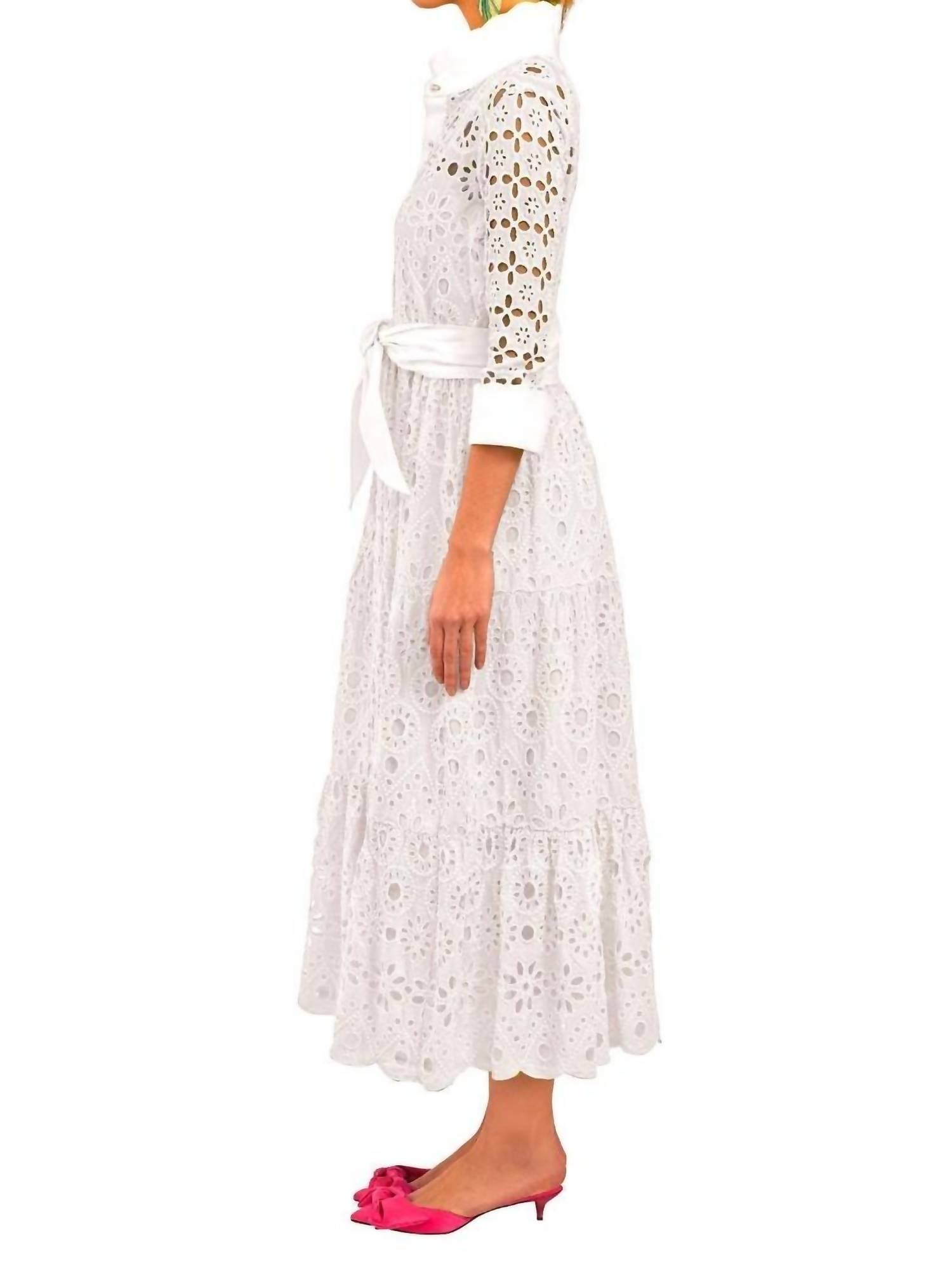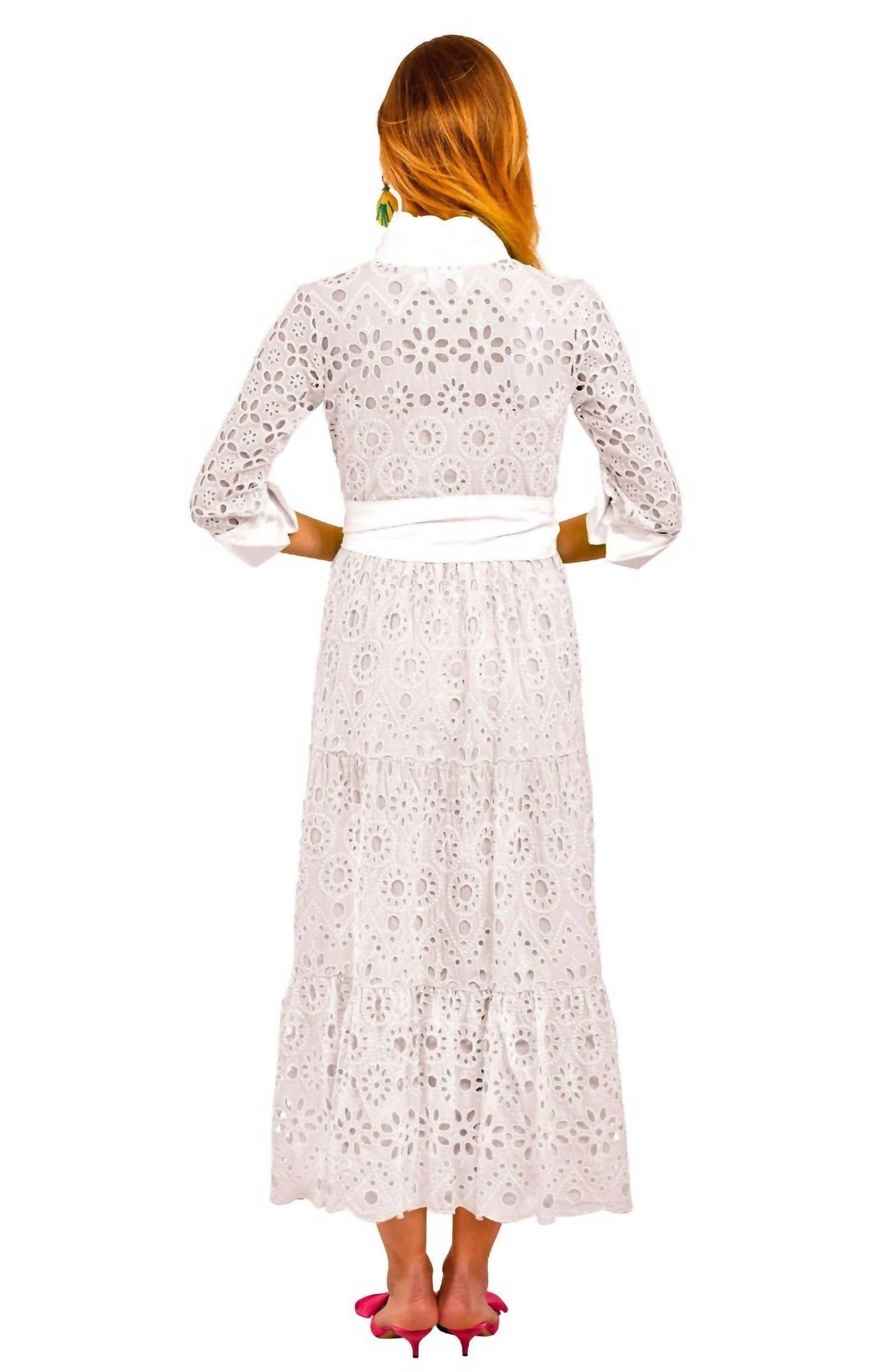 Длина 50 дюймов. Контрастный воротник и передняя планка из хлопкового пике / манжеты 3 дюйма. Фестончатая окантовка воротника / манжет / подола. Пуговицы-ракушки. Карманы в боковых швах. Эластичная талия с петлями для ремня, связанными крючком. Многоуровневая присборенная юбка. Вышивка люверсами по всему изделию. Подкладка. Контрастный пояс из хлопкового пике размером 61 x 4 дюйма, завязывающийся самостоятельно. 100% хлопок. Машинная стирка в холодной/холодной воде. Сушить в стиральной машине или в химчистке.