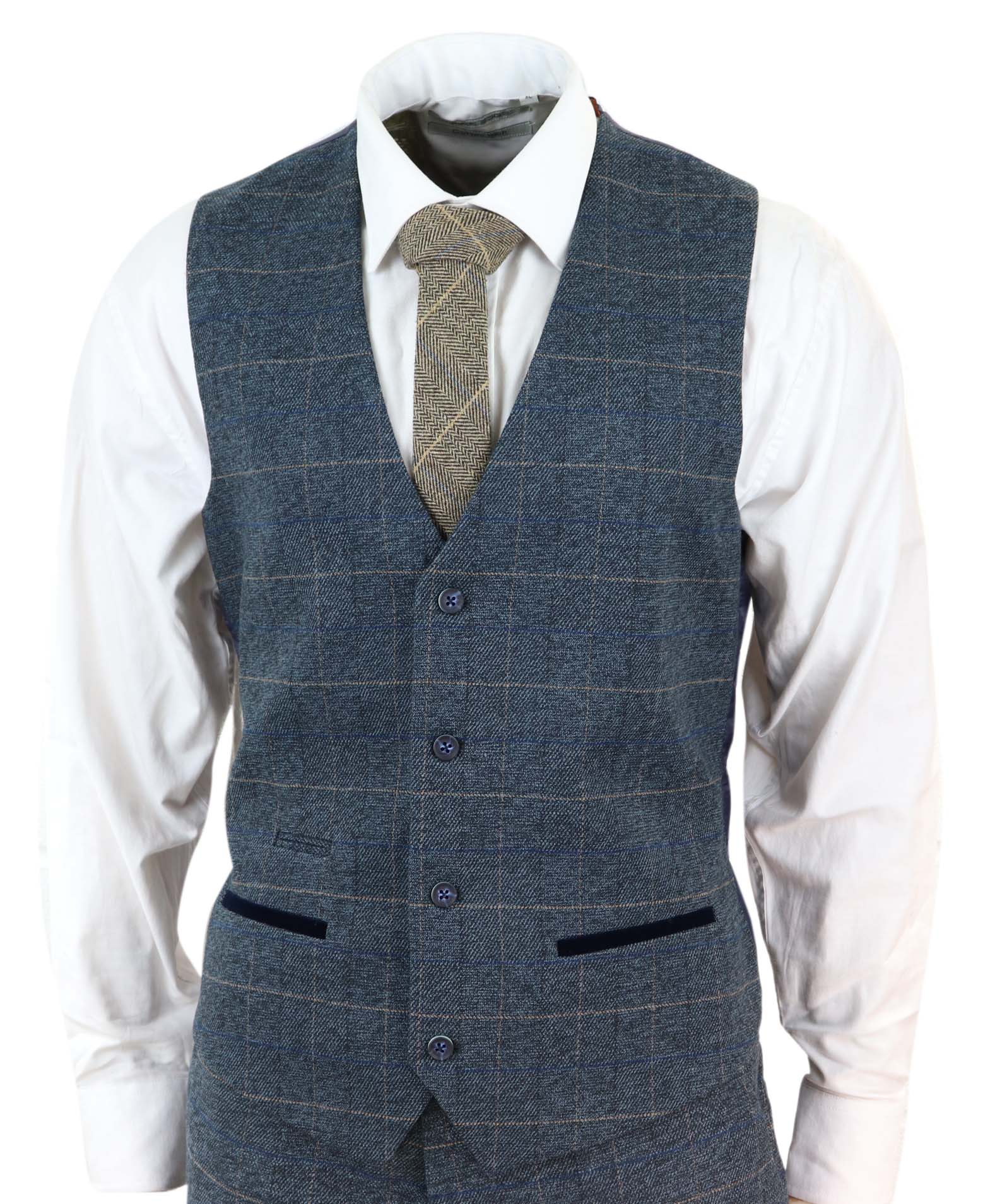 Выполнено из твидовой клетчатой ткани, в комплекте с блейзером, брюками и жилетом.