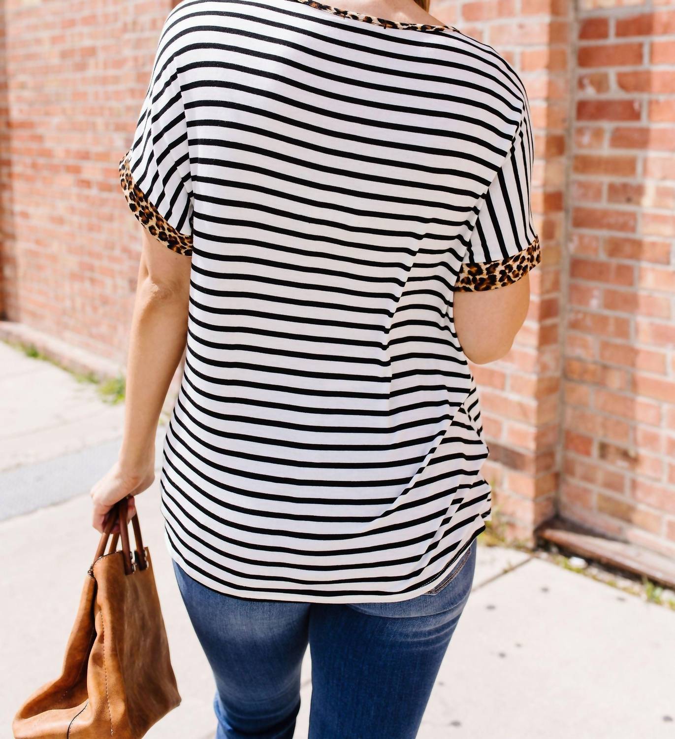 Имеет поворот на подоле и V-образный вырез, отделанный леопардовым принтом и подчеркнутый перекрещивающимися лямками. Леопардовый принт на манжетах связывает все воедино.
