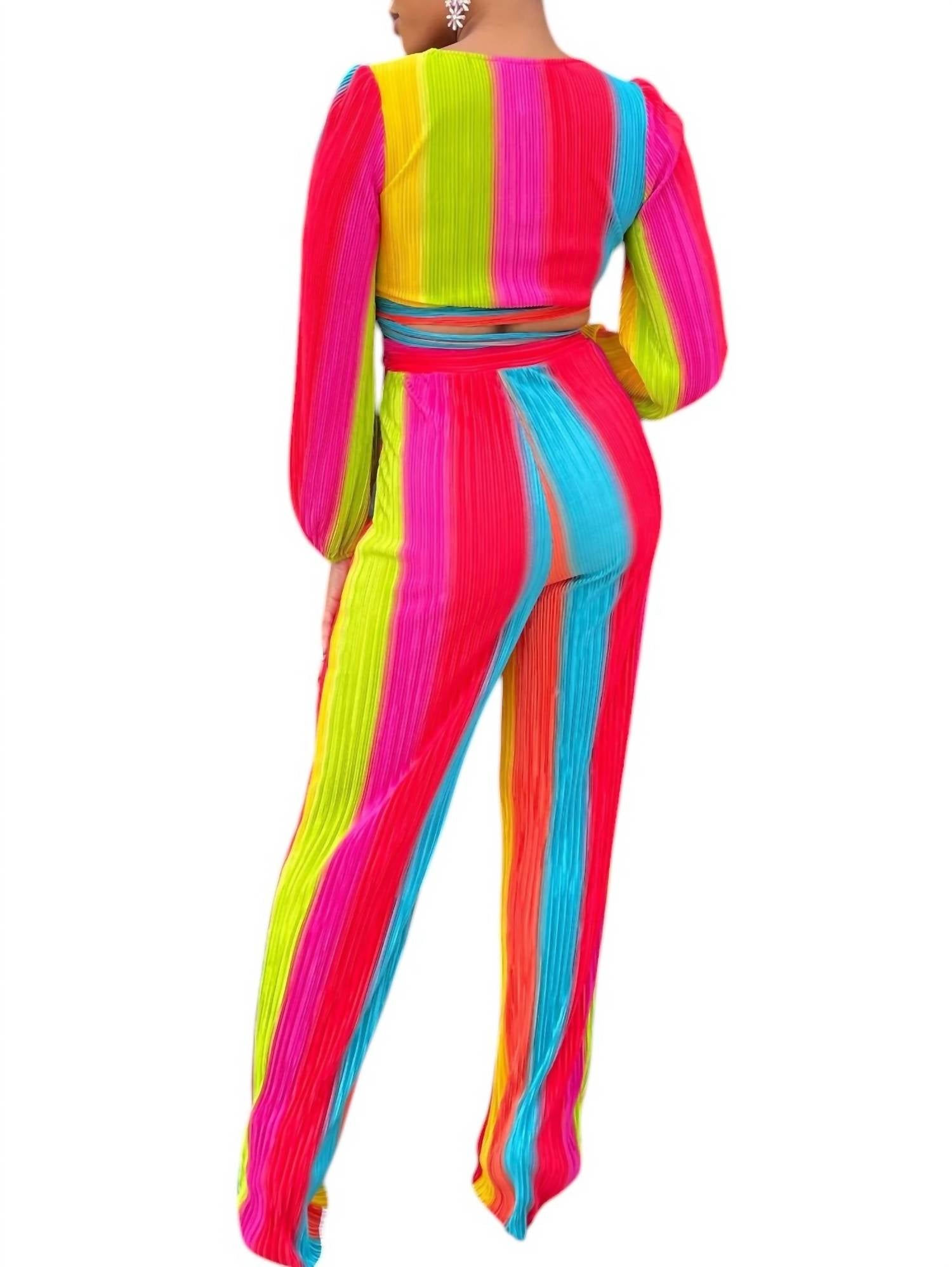 Покажите немного кожи в этом милом и повседневном укороченном топе. Представляем комплект из 2-х предметов брюк от Cameo, эффектный ансамбль, призванный обратить на себя внимание. Верх с длинными рукавами и глубоким V-образным вырезом прекрасно подчеркивает универсальную застежку-галстук. Брюки-накидки и укороченный топ выполнены из плиссированной ткани с ярким рисунком в разноцветные желтые вертикальные полосы. Этот комплект, идеально подходящий для смелого, шикарного образа, улучшит ваш гардероб своим уникальным дизайном.