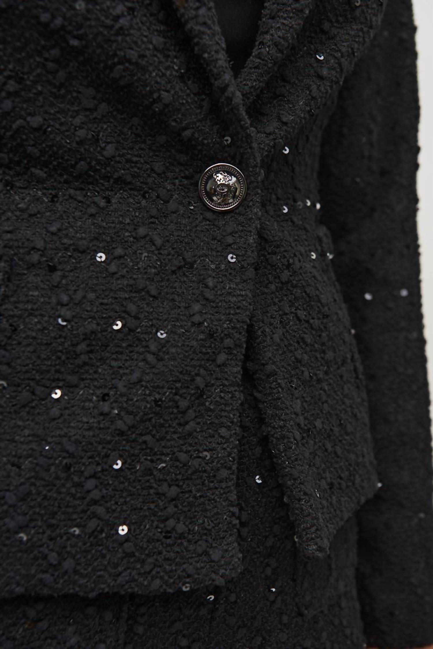 Изысканность в сочетании с комфортом и универсальностью. Длинный рукав пиджака. Изготовлен из роскошной смеси 98% полиэстера и 2% спандекса в букле, украшенной мерцающими пайетками. Стильный зазубренный воротник и накладные карманы, подчеркнутые отделкой цепочкой. Застегивается на классические пуговицы. Уход за этим изделием без подкладки: ручная стирка в холодной воде с вещами похожих цветов, сушка в расправленном виде в тени, избегание отбеливания, глажки и химчистки.