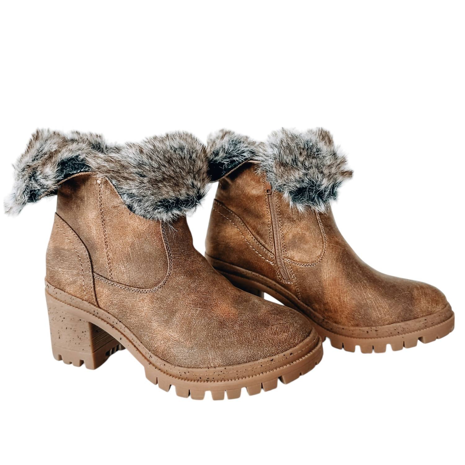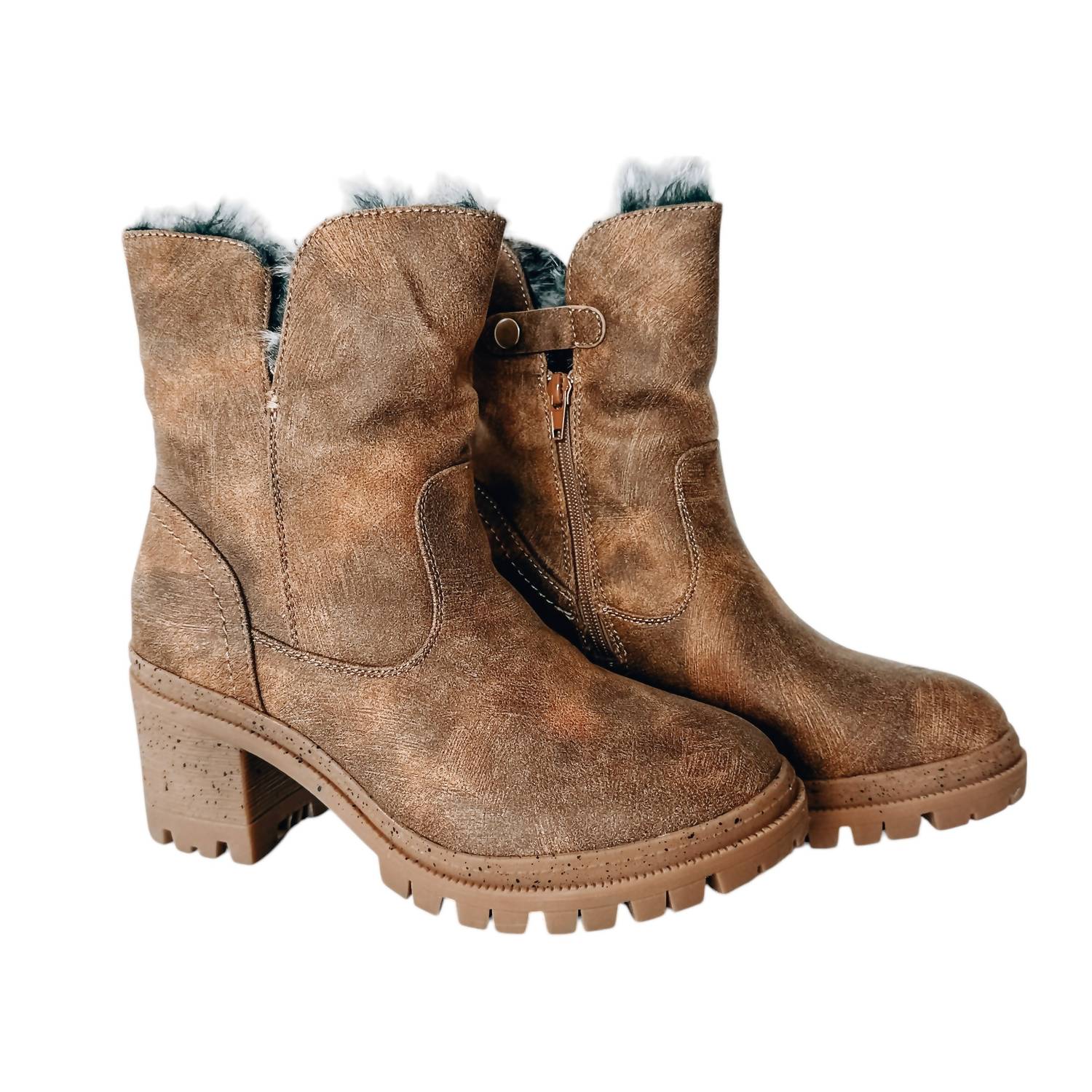 Эти слипоны имеют подкладку из искусственного меха и сделаны из веганской замши. Они имеют боковую молнию для легкого надевания, эластичную вставку для гибкой посадки и толстый каблук высотой 2,5 дюйма для дополнительного стиля и комфорта.