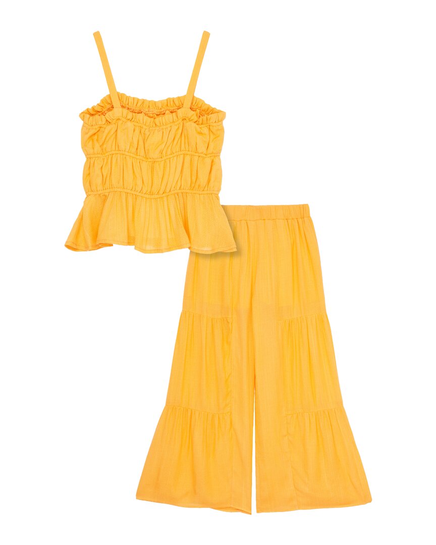 Представляем комплект льняных брюк Truce Metallic для вашей маленькой модницы! Этот модный комплект одежды включает в себя металлизированный оранжевый топ с присборенными деталями дизайна и широкие льняные брюки. Изготовленный из удобной смеси 95% вискозы и 5% спандекса, этот комплект идеально подходит для повседневной носки. Благодаря свободному крою и ткани, пригодной для машинной стирки, родители могут легко поддерживать стильный вид своего малыша. Импортированный для вашего удобства, этот комплект брюк Truce наверняка станет любимым в гардеробе вашего ребенка.
