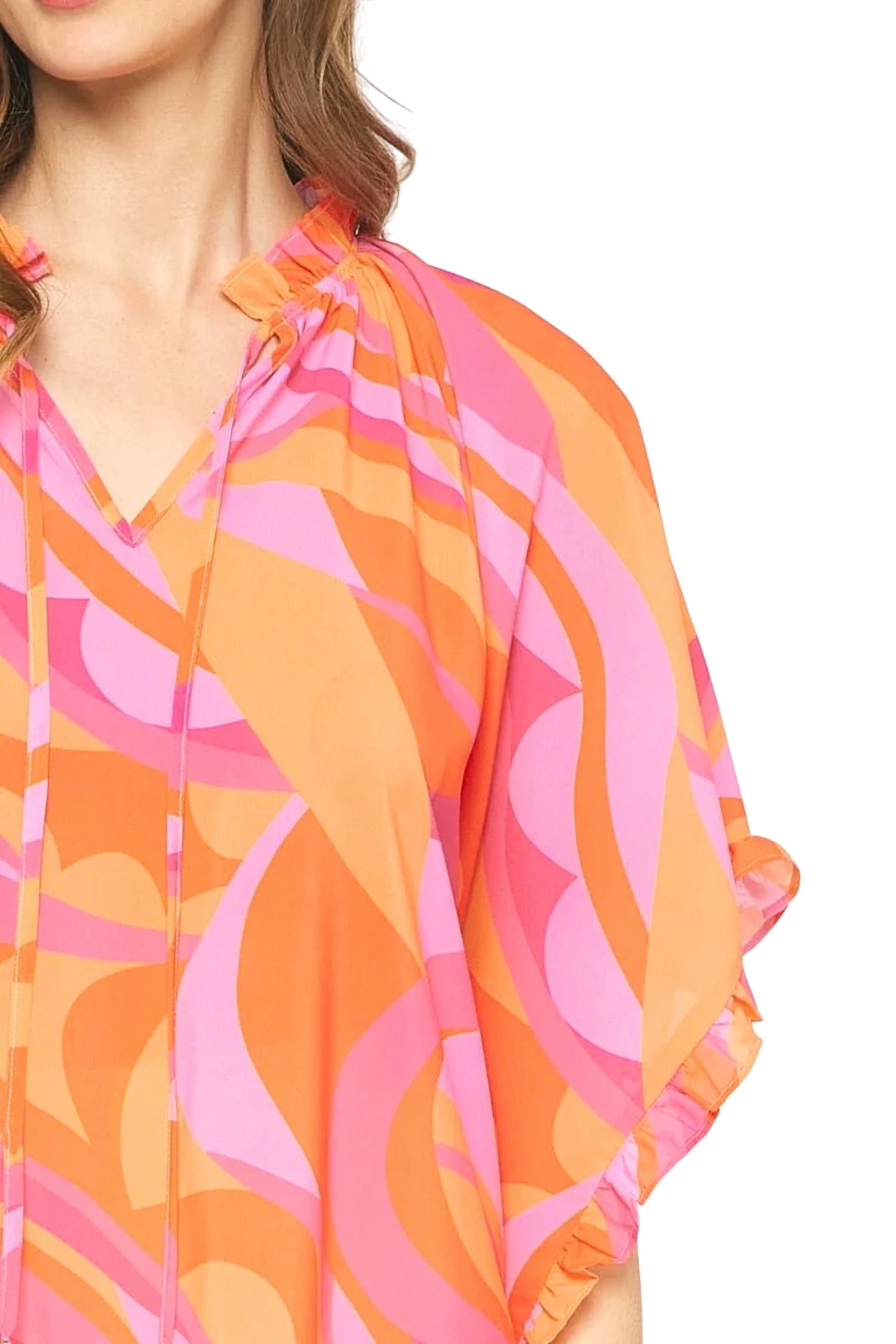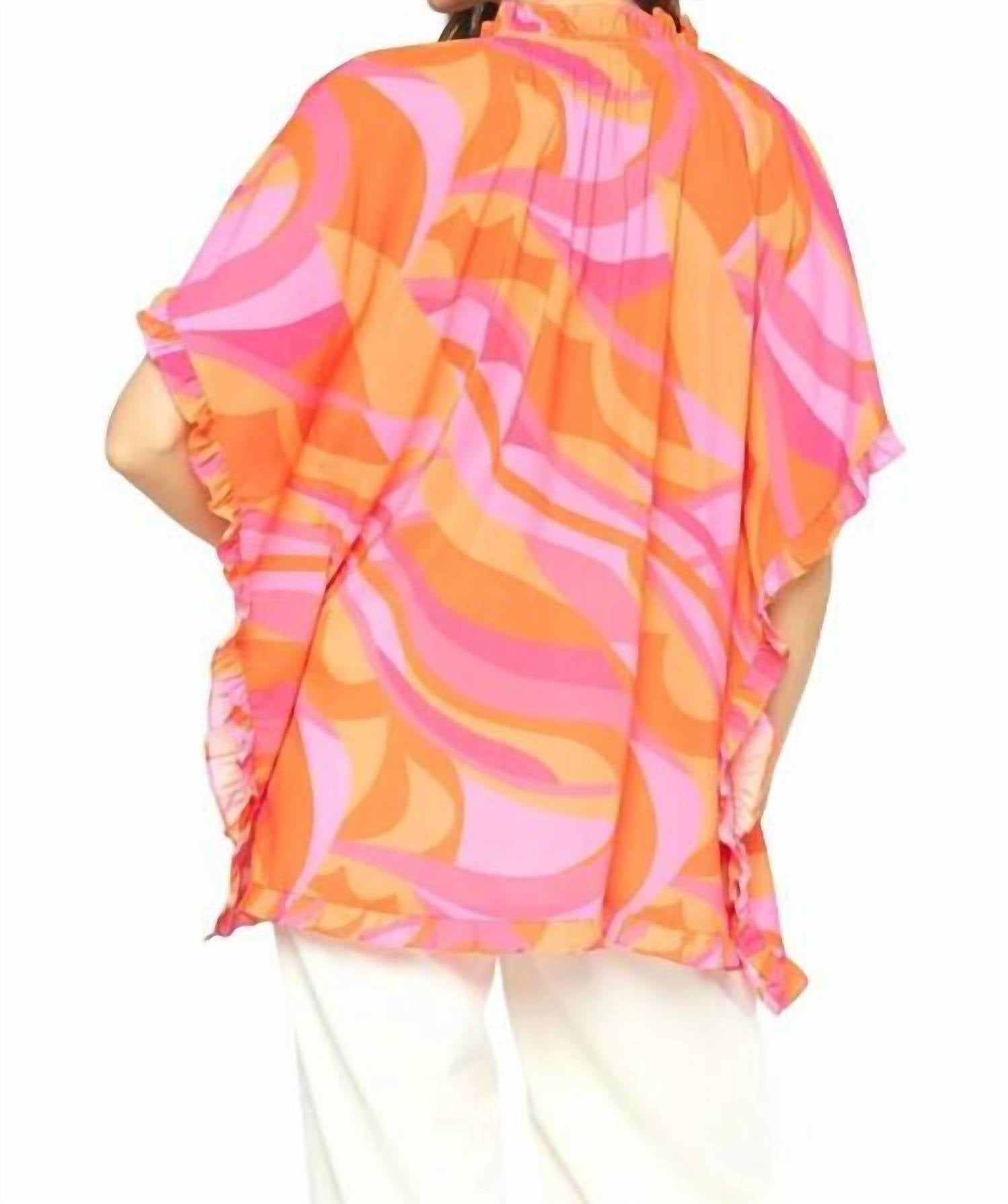 С короткими рукавами-оборками и струящимся силуэтом пончо эта вещь может похвастаться искусным принтом в оттенках оранжевого и розового. Сделанная из 100% полиэстера, она обеспечивает комфорт и женственность с завязывающимся V-образным вырезом и оборчатым подолом. Она имеет застежку-липучку и требует простого ухода с холодной ручной стиркой и сушкой на веревке.