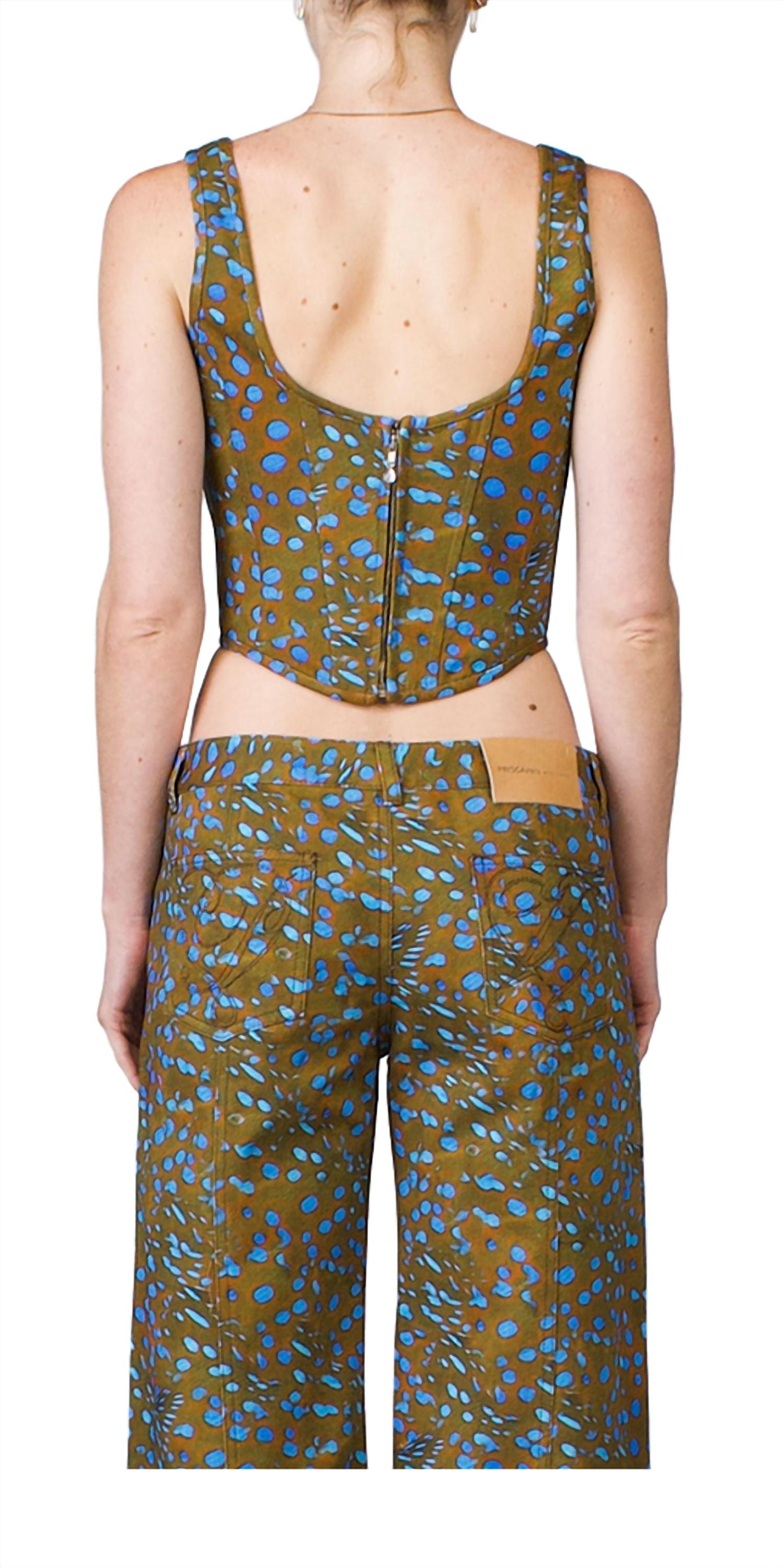 Сделано в Нью-Йорке, корсетный топ PRISCAVera с закругленным квадратным вырезом и укороченным силуэтом. Изготовлен из стираной джинсовой ткани с принтом ската FW22. Особенности включают в себя косточки по всей длине с верхней строчкой на каждом шве, закругленный высокий низкий подол и вытачки на груди. Подробности - Цвет - скат. 100% хлопок. Стираная джинсовая ткань. Закругленный квадратный вырез. Укороченный силуэт. Застежка-молния сзади. Сделано в Нью-Йорке. Соответствует размеру. Модель ростом 5 футов 5 дюймов, на ней размер S