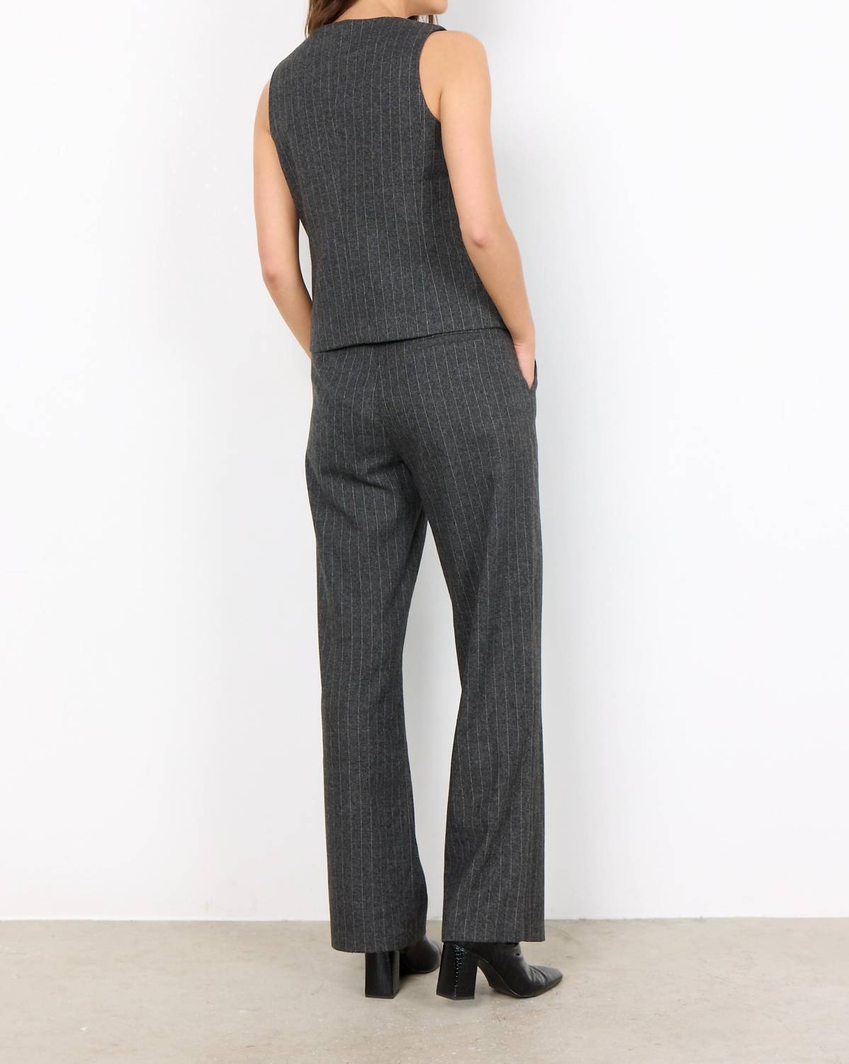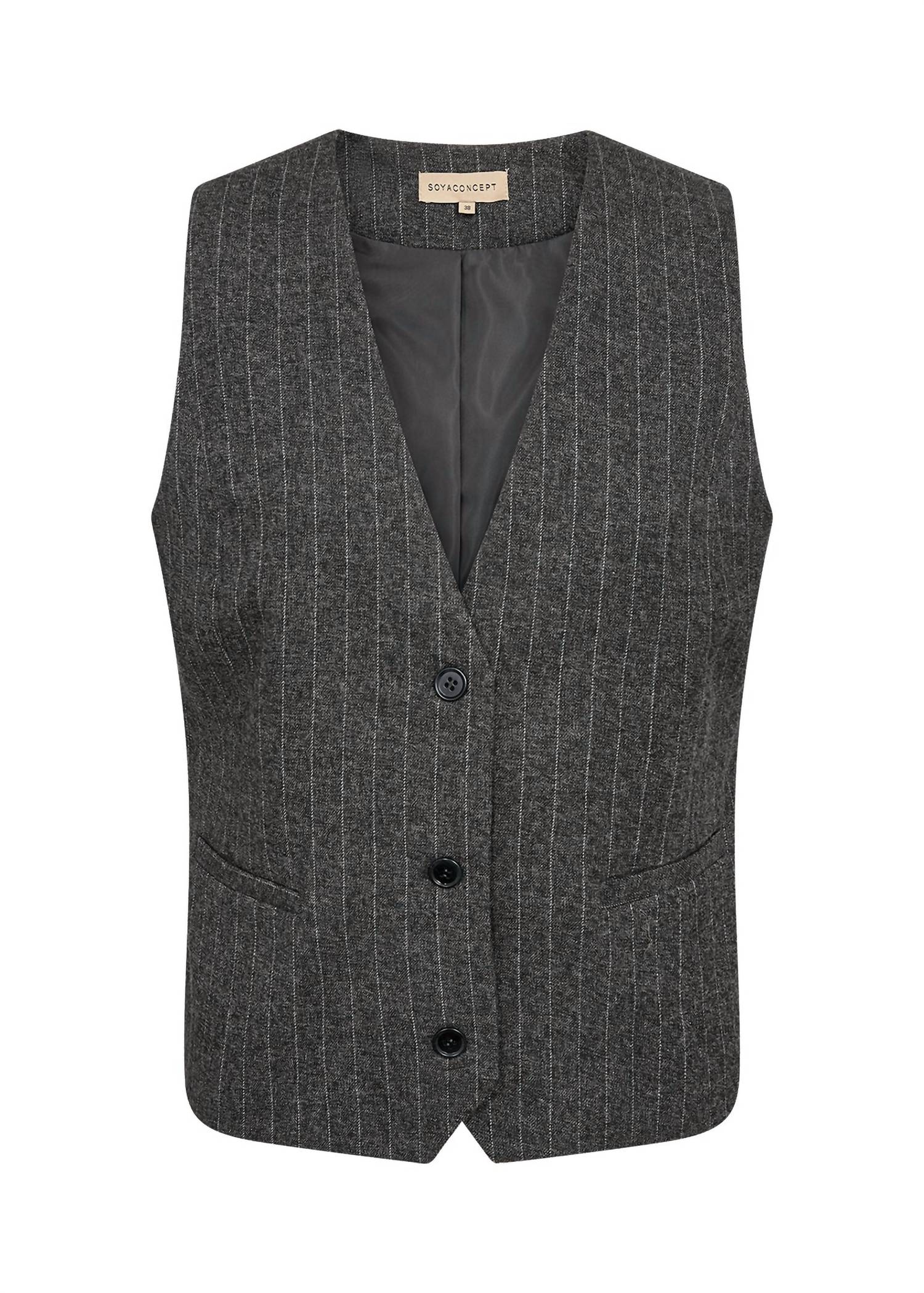 Представляем жилет Victoria Vest, изысканное изделие, искусно изготовленное из смеси 68% полиэстера, 30% вискозы и 2% эластана. Этот жилет в тонкую полоску без рукавов имеет привлекательный V-образный вырез и застежку на пуговицы, обеспечивая строгий крой и классический текстурированный вид. Идеально подходит для придания нотки современной элегантности любому наряду, он легко сочетается с подходящими брюками и обувью по вашему выбору для создания шикарного ансамбля. Уход - Ручная стирка в холодной воде и сушка на веревке.