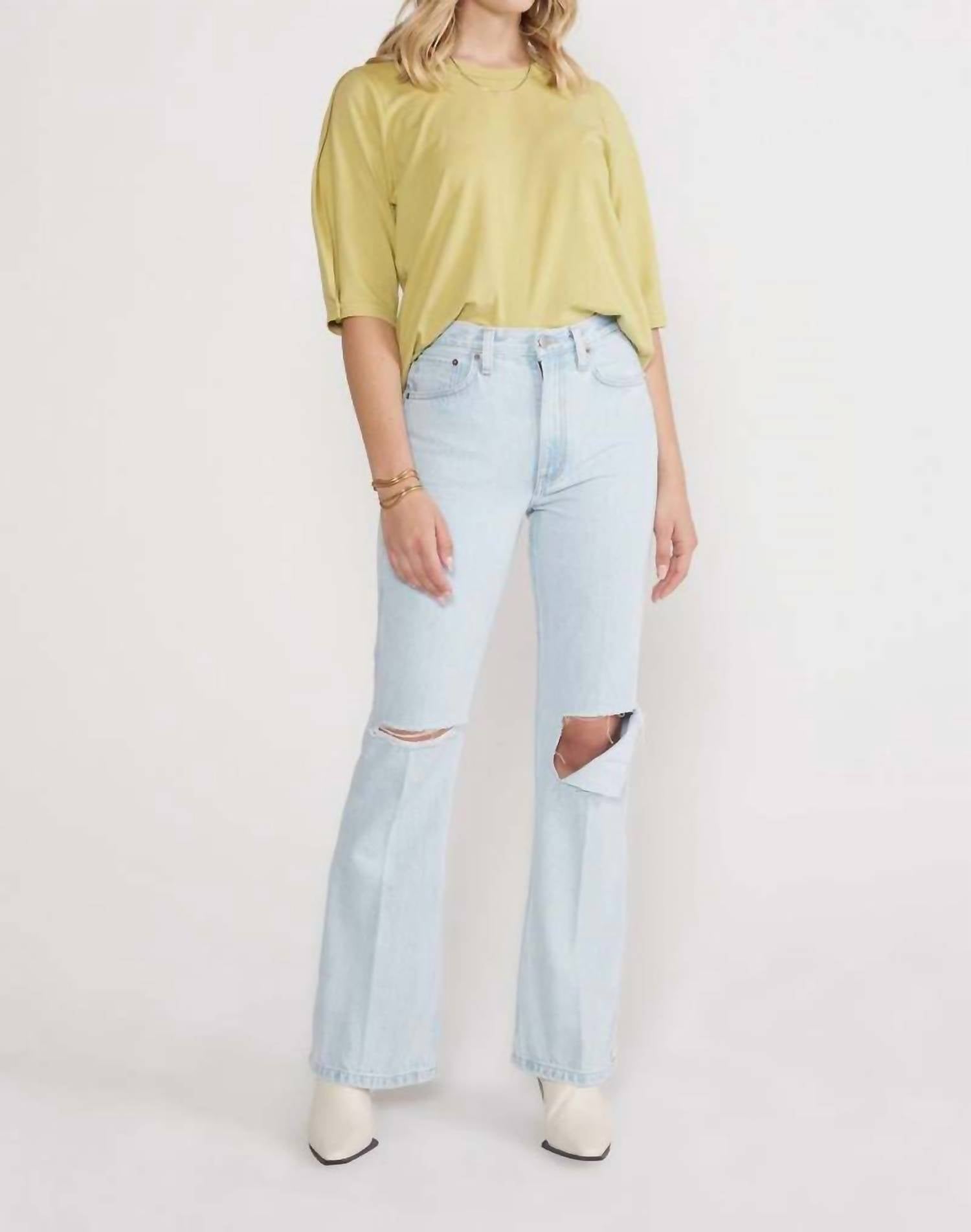 Привлекательный силуэт, который удивительно универсален. Джинсы Sasha Modern Flare от ETICA в цвете Sea Breeze сочетают в себе смелый стиль с классическим блеском, а аутентичные разрезы на коленях придают характер дизайну. Изготовленные из 100% органического хлопкового денима, они обещают комфорт благодаря высокой посадке 11,5 дюймов и привлекательному внутреннему шву 33 дюйма. Застежка - застежка-молния. Уход - машинная стирка в холодной воде с вещами похожих цветов, сушка на веревке, не отбеливать, при необходимости гладить теплым утюгом. На модели размер 27.