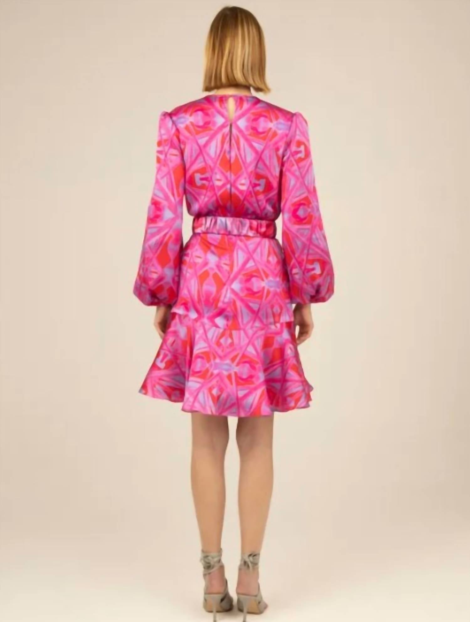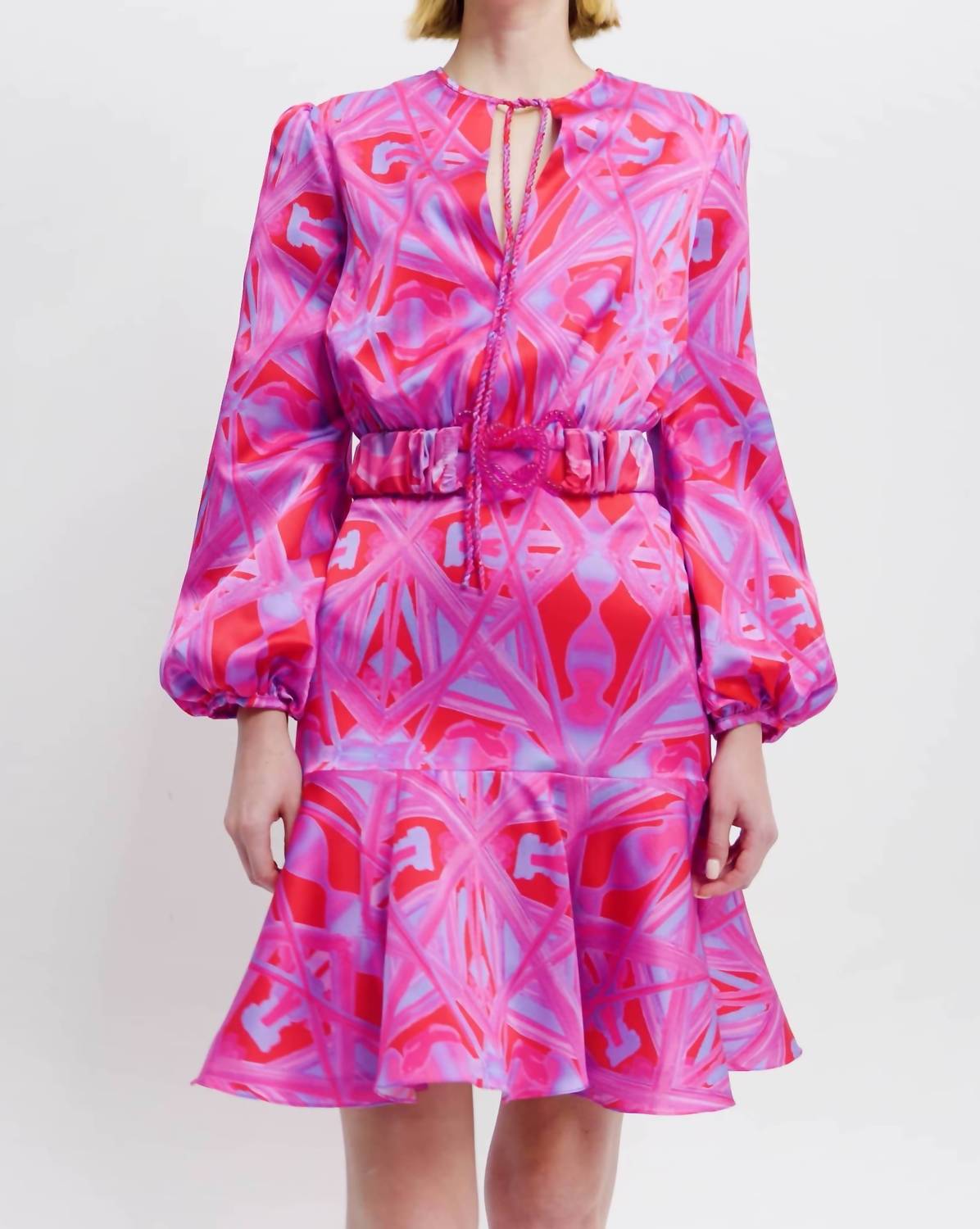 Это женственное и изысканное платье Fiorenza, которое рисует итальянскую эстетику середины двадцатого века. Принт пурпурного калейдоскопа завораживает цветом. Платье из шелка в мини-платье с оборками. Вздымающиеся рукава реглан, подкладка из органзы. Оно отличается непринужденной заправленной блузкой сверху, съемным эластичным поясом с итальянской пряжкой из смолы и вырезом-замочной скважиной с плетеным шнурком, похожим на веревку. Эти завязки можно завязывать на вырезе или вокруг шеи. Цвет - пурпурный калейдоскоп. Состав - 94% шелк, 6% эластан. Посадка - точно по размеру