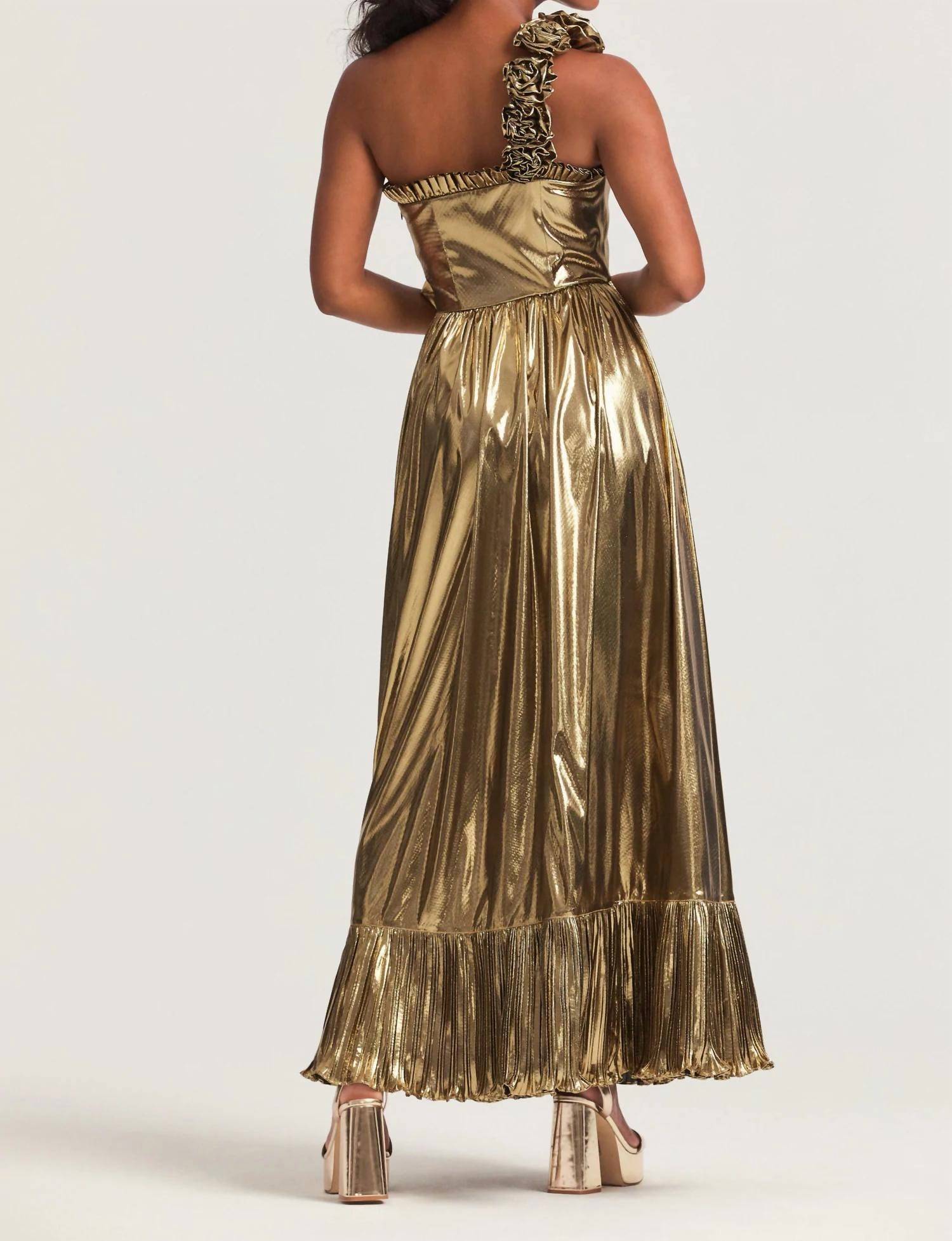 Платье на одно плечо представляет собой смесь блестящей гладкой и плиссированной ткани ламе, создающей роскошную текстуру, скульптурные цветы ламе украшают плечо и талию, прежде чем спуститься к струящейся юбке с кокетливым разрезом на левой ноге владелицы. 100% полиэстер. Только ручная стирка. Сушить на горизонтальной поверхности. Не подвергать химчистке. Длина от плеча до подола составляет примерно 60,5 дюймов. На модели размер 2. Ее параметры: рост - 5 футов 10 дюймов, бюст - 31,5 дюйма, талия - 25 дюймов, бедра - 35,5 дюймов.